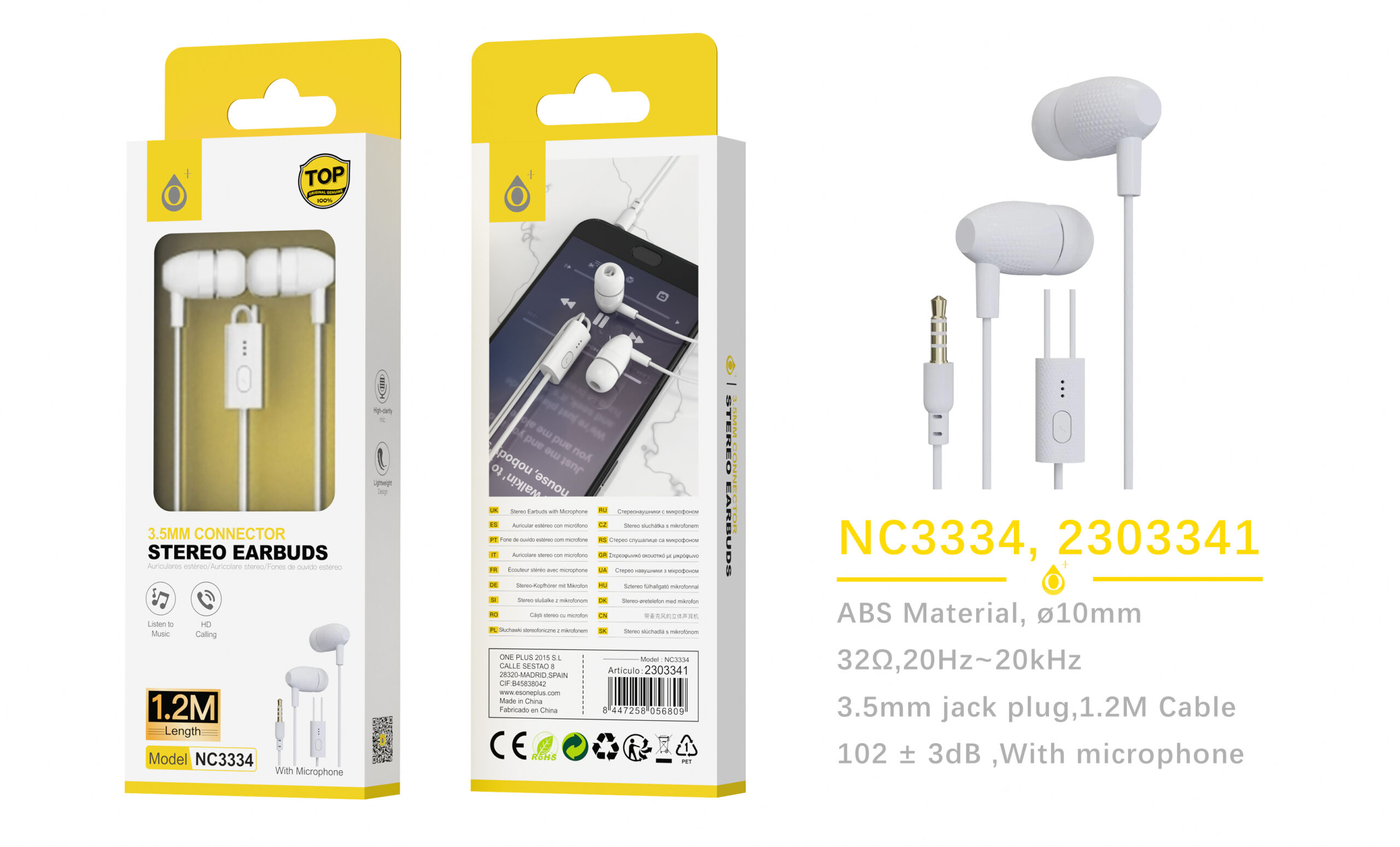 NC3334 BL Auriculares con microfono, cable Jack 3.5mm/1.2M, Blanco