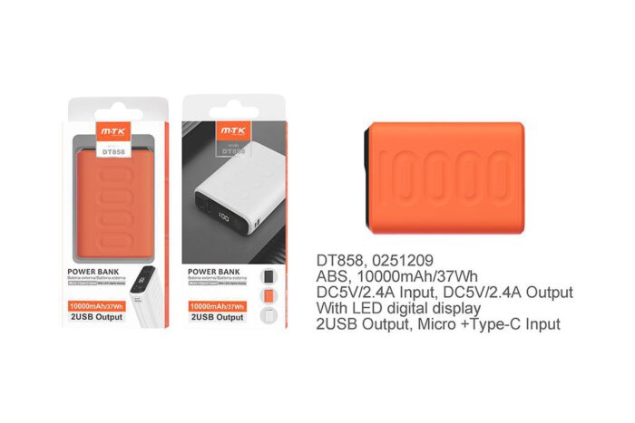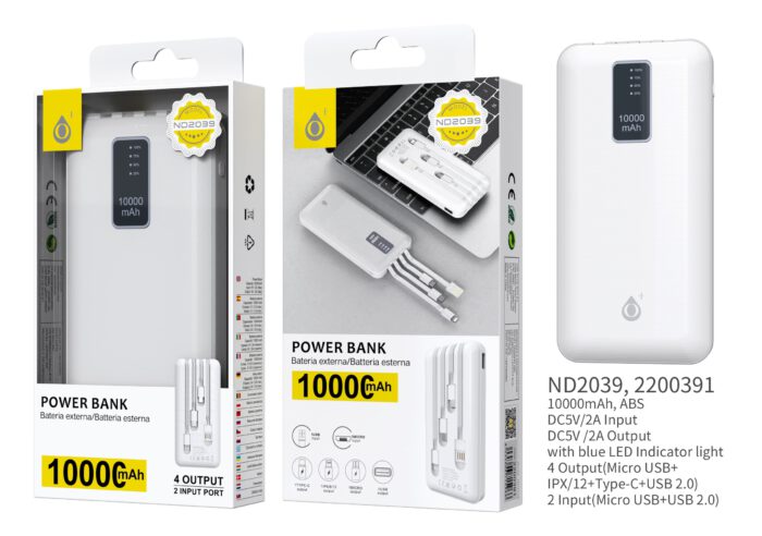 • ND2044 BL Powerbank 8000mAh 2A salida,Con 3 conexciones de entrada(Micro USB+Type-C+USB 2.0) y 4 de salida (Micro USB+Iphone+Type-C+USB 2.0), Blanco