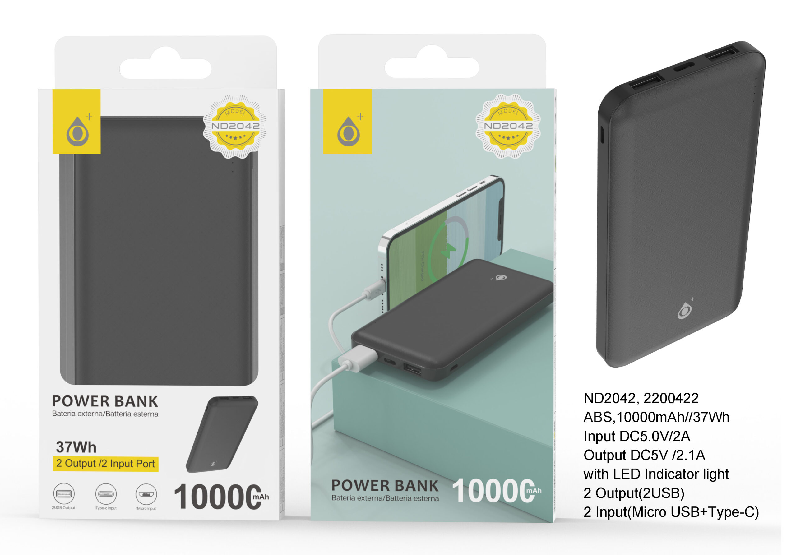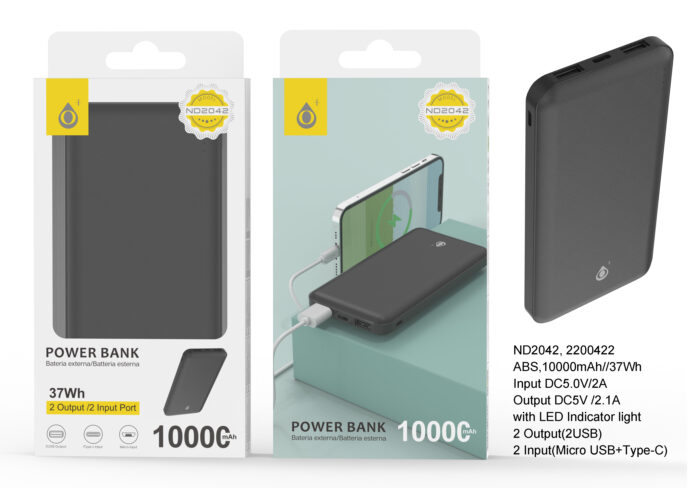 ND2042 NE PowerBank AXEL 10000mAh/37Wh,2entrada(Micro USB+Type-C)2 Salida(2USB),Negro