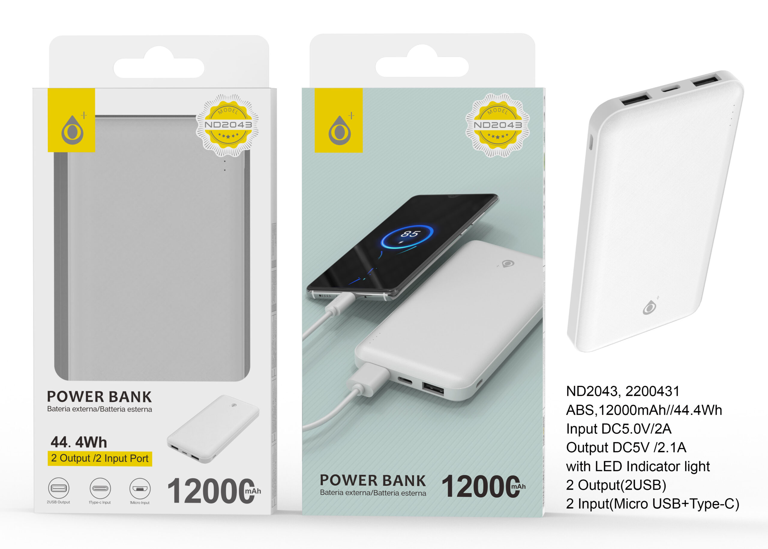 ND2043 BL PowerBank AXEL 12000mAh/44.4Wh,2 entrada(Micro USB+Type-C)2 Salida(2USB),Blanco
