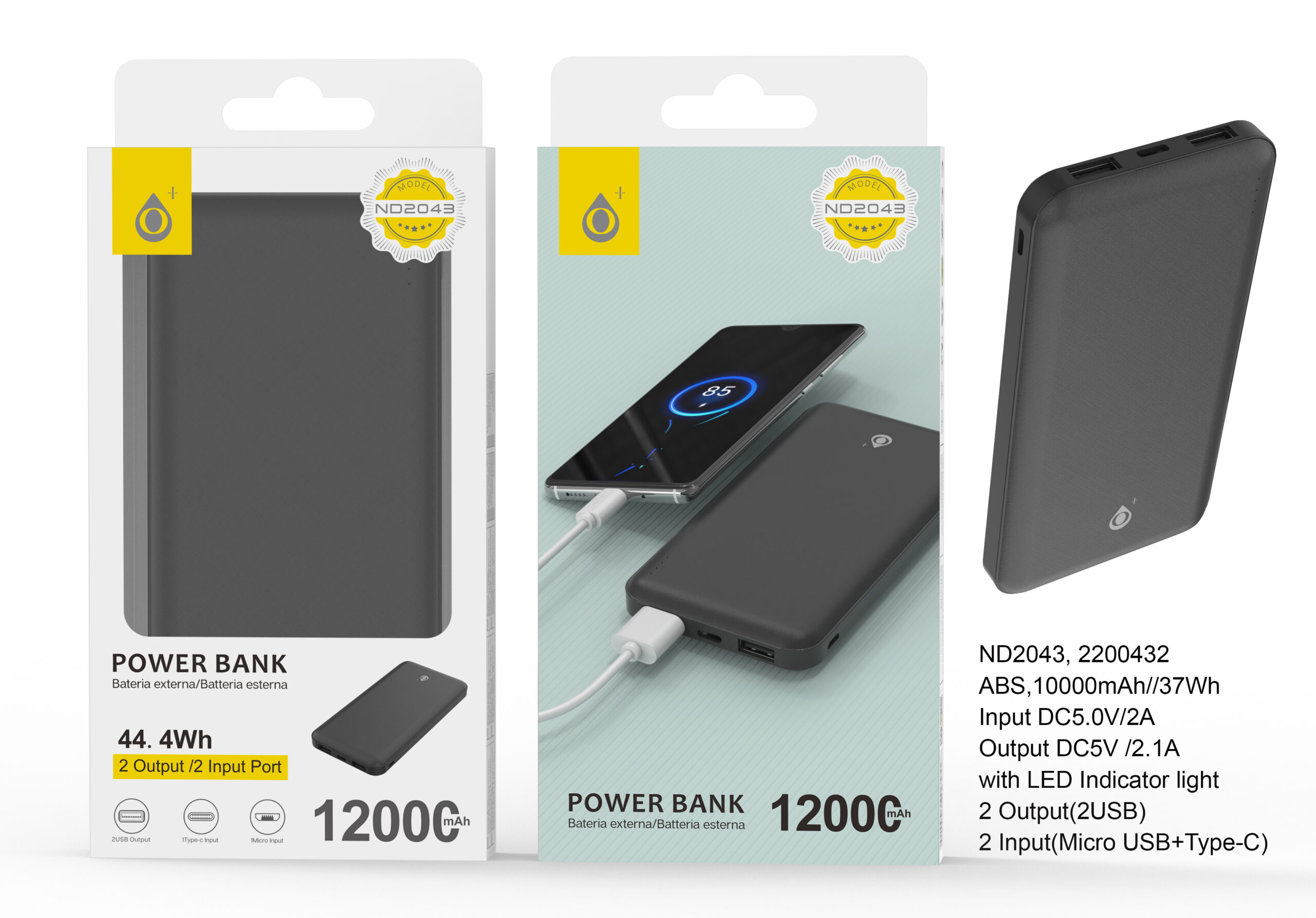 ND2043 NE PowerBank AXEL 12000mAh/44.4Wh,2entrada(Micro USB+Type-C)2 Salida(2USB),Negro
