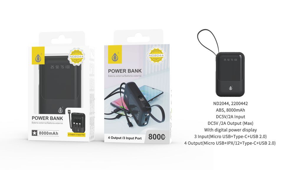 ND2044 NE Powerbank 8000mAh 2A salida,Con 3 conexciones de entrada(Micro USB+Type-C+USB 2.0) y 4 de salida (Micro USB+Iphone+Type-C+USB 2.0), Negro