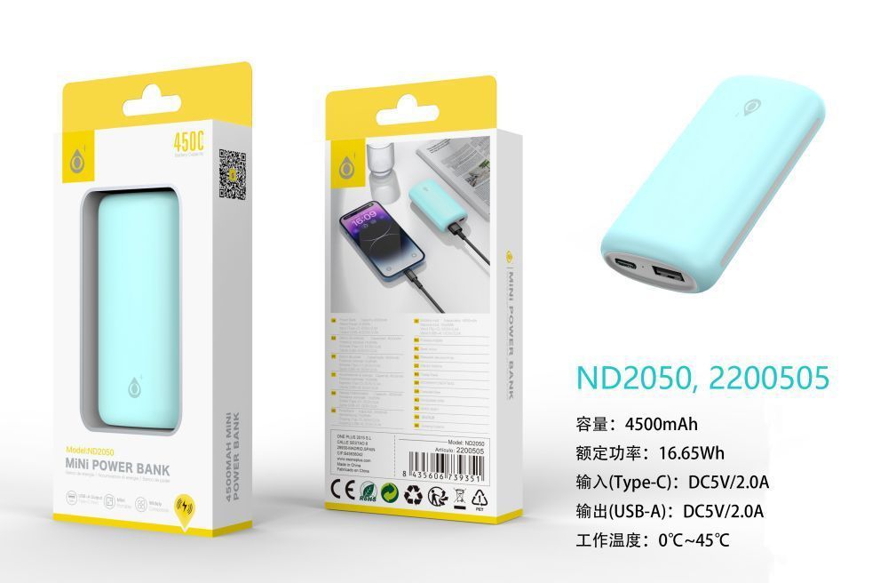 ND2050 AZ PowerBank 4500mAh/16.65Wh, 1 Entrada USB-C y 1 Salida 1USB-A, Azul