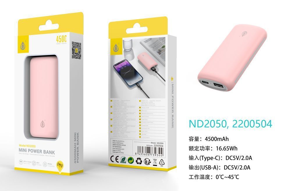 ND2050 RS PowerBank 4500mAh/16.65Wh, 1 Entrada USB-C y 1 Salida 1USB-A, Rosa