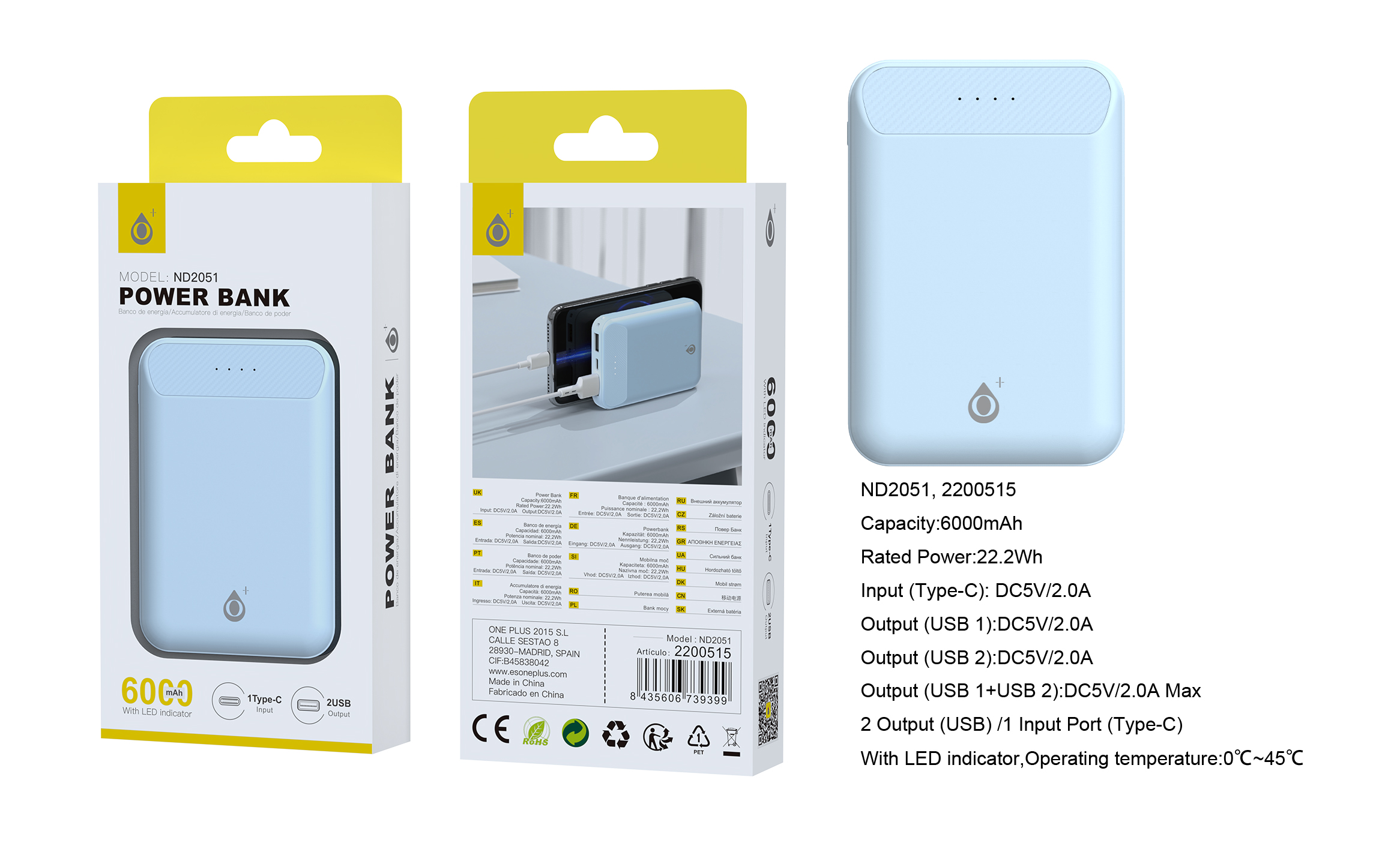 ND2051 AZ PowerBank Omar 6000mAh/22.2Wh Con Indicador LED, 1 entrada(Type-C), 2 salida(USB-A), Blanco