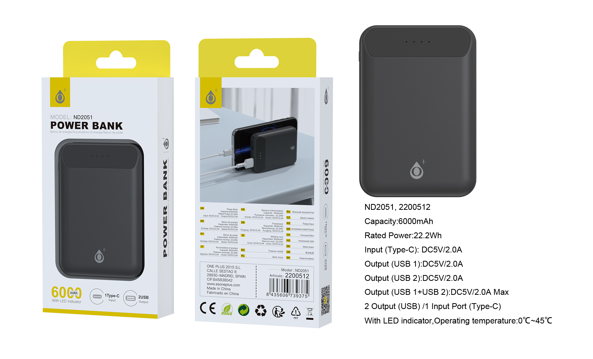 ND2051 NE PowerBank Omar 6000mAh/22.2Wh Con Indicador LED, 1 entrada(Type-C), 2 salida(USB-A), Negro