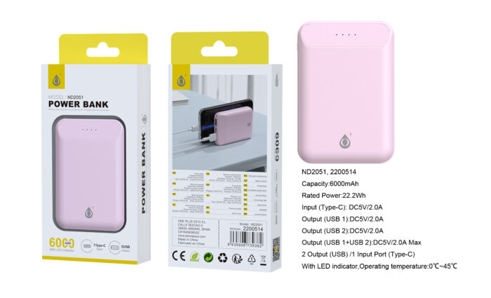 ND2051 RS PowerBank Omar 6000mAh/22.2Wh Con Indicador LED, 1 entrada(Type-C), 2 salida(USB-A), Rosa