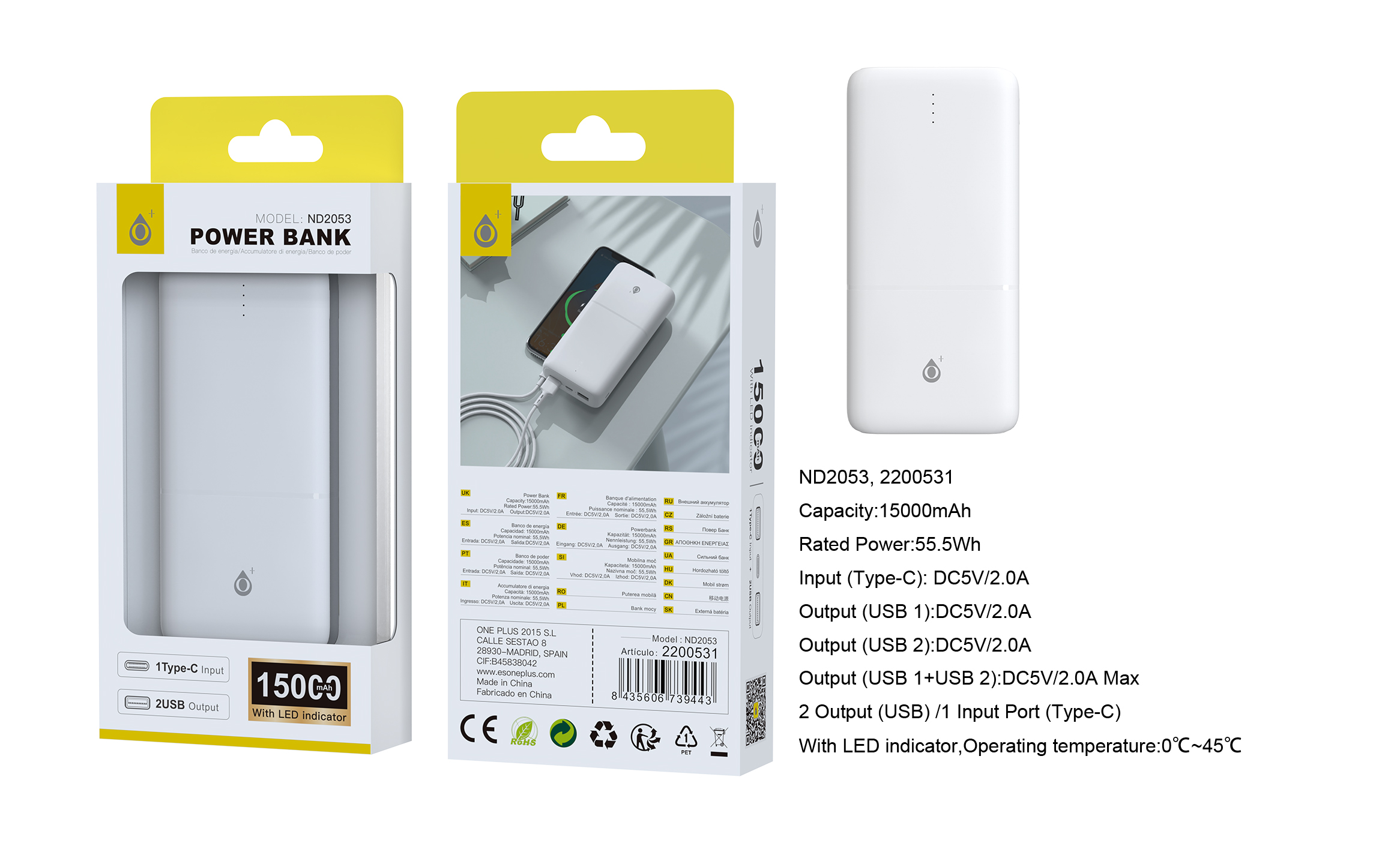 ND2052 BL PowerBank Omar 9000mAh/33.3Wh Con Indicador LED, 1 entrada(Type-C), 2 salida(USB-A), Blanco
