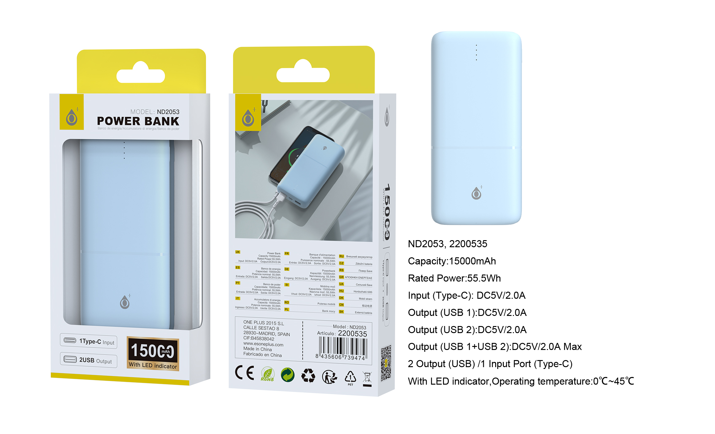 ND2053 AZ PowerBank Omar 15000mAh/55.5Wh Con Indicador LED, 1 entrada(Type-C), 2 salida(USB-A), Azul