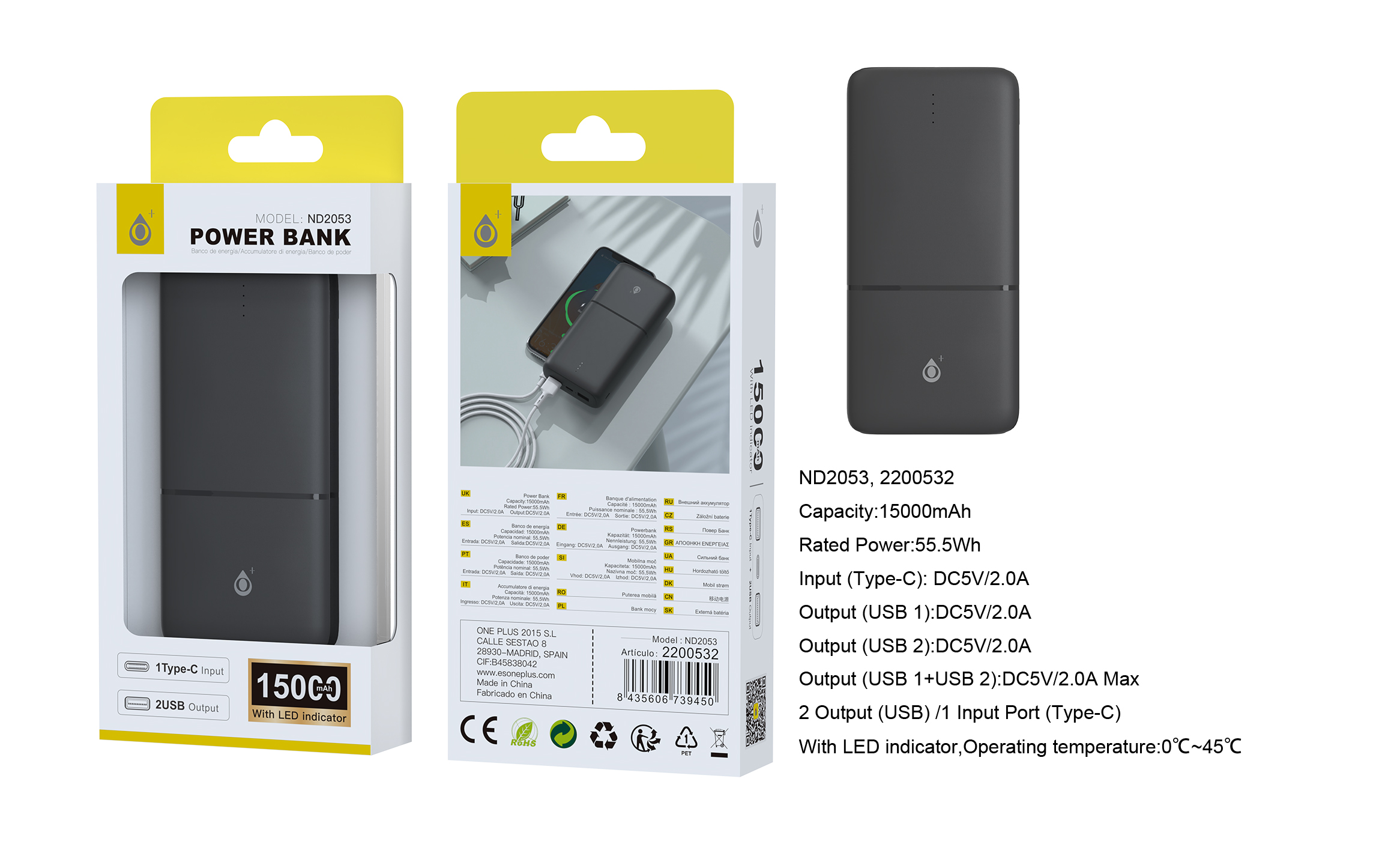 ND2053 NE PowerBank Omar 15000mAh/55.5Wh Con Indicador LED, 1 entrada(Type-C), 2 salida(USB-A), Negro