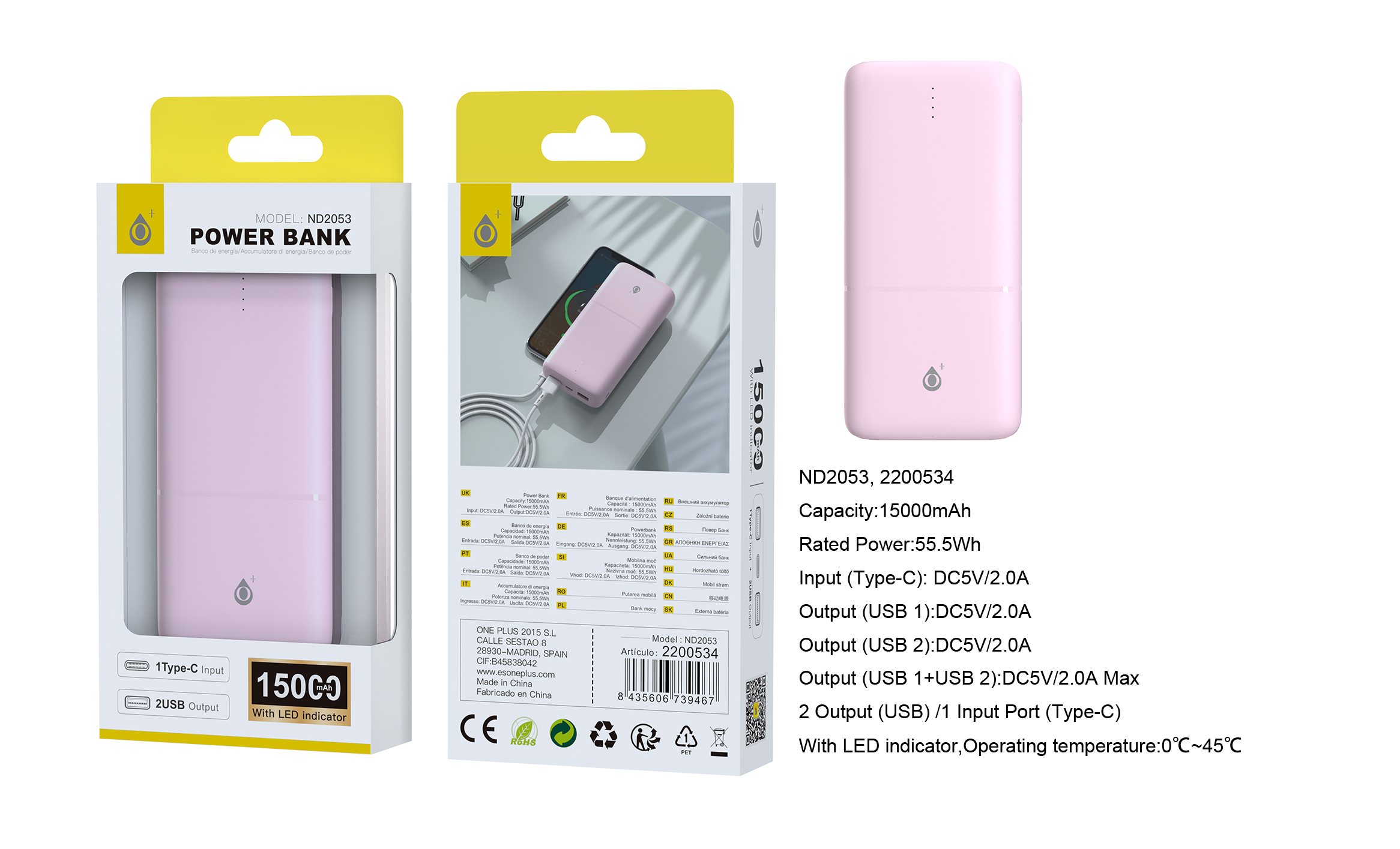 ND2053 RS PowerBank Omar 15000mAh/55.5Wh Con Indicador LED, 1 entrada(Type-C), 2 salida(USB-A), Rosa