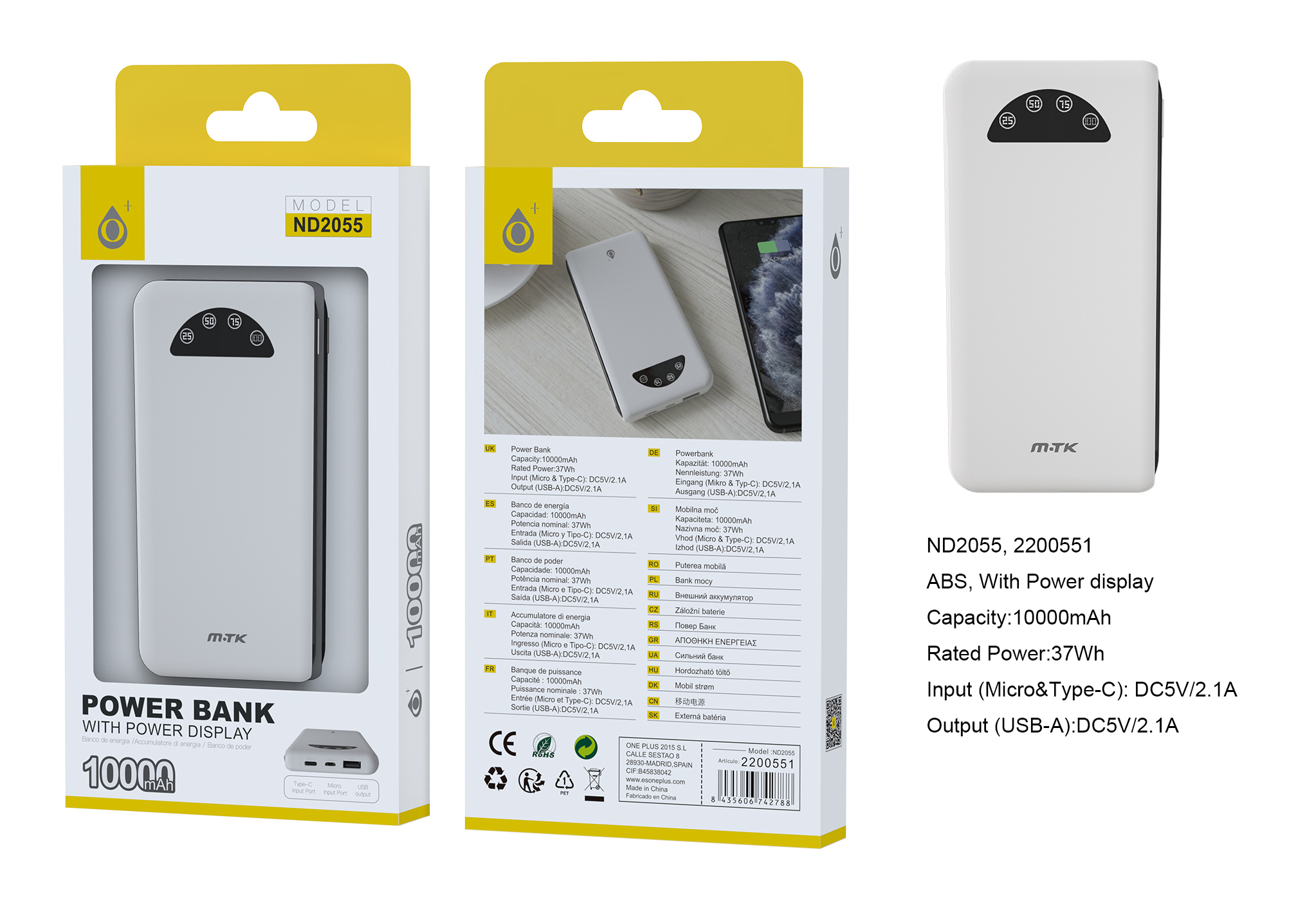 ND2055 BL Powerbank  con indicador bateria 10000mAh/37Wh, 1 Salida USB-A  y 2 Entrada USB-C+Micro),Blanco