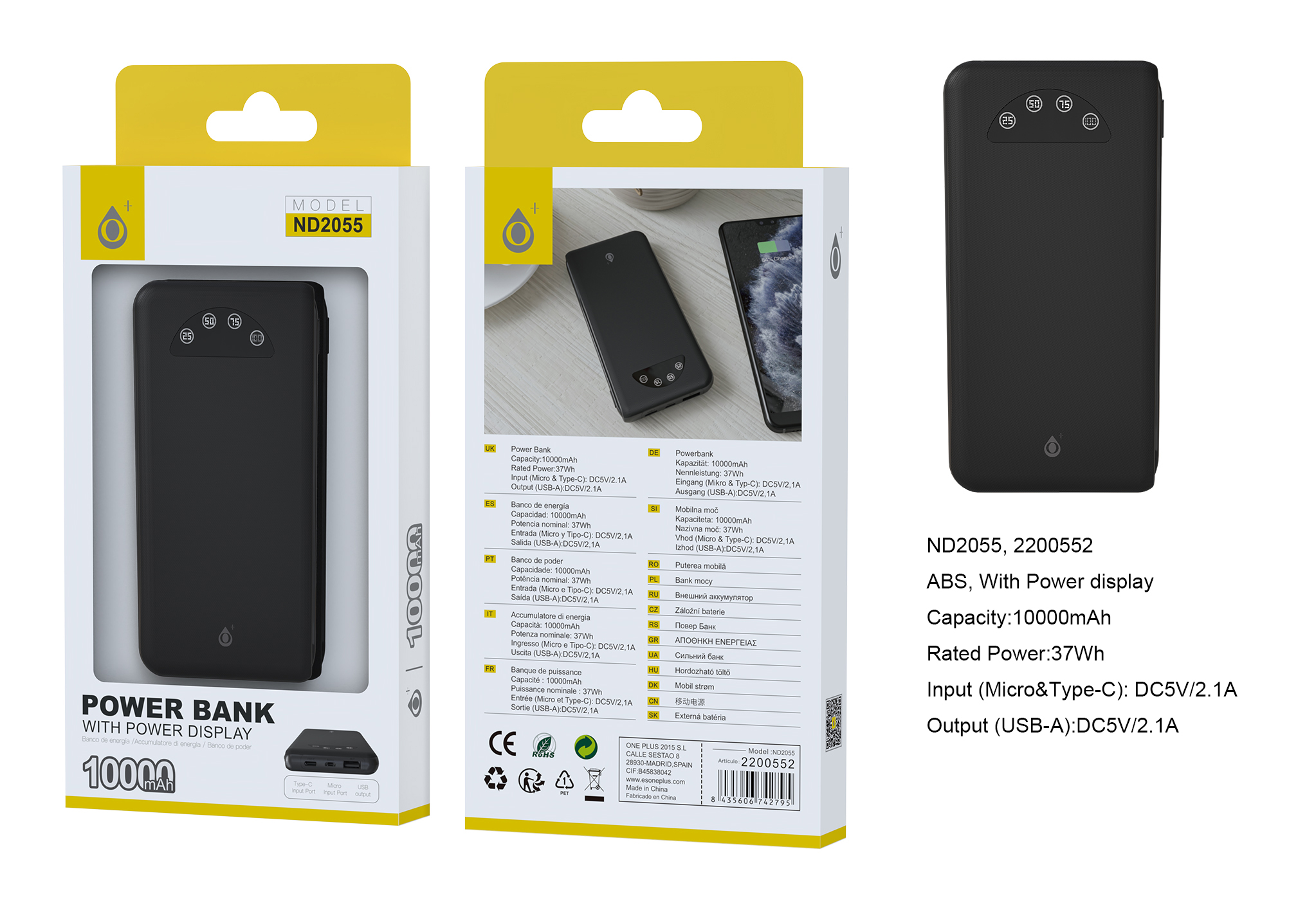 ND2055 NE Powerbank  con indicador bateria 10000mAh/37Wh, 1 Salida USB-A  y 2 Entrada USB-C+Micro), Negro