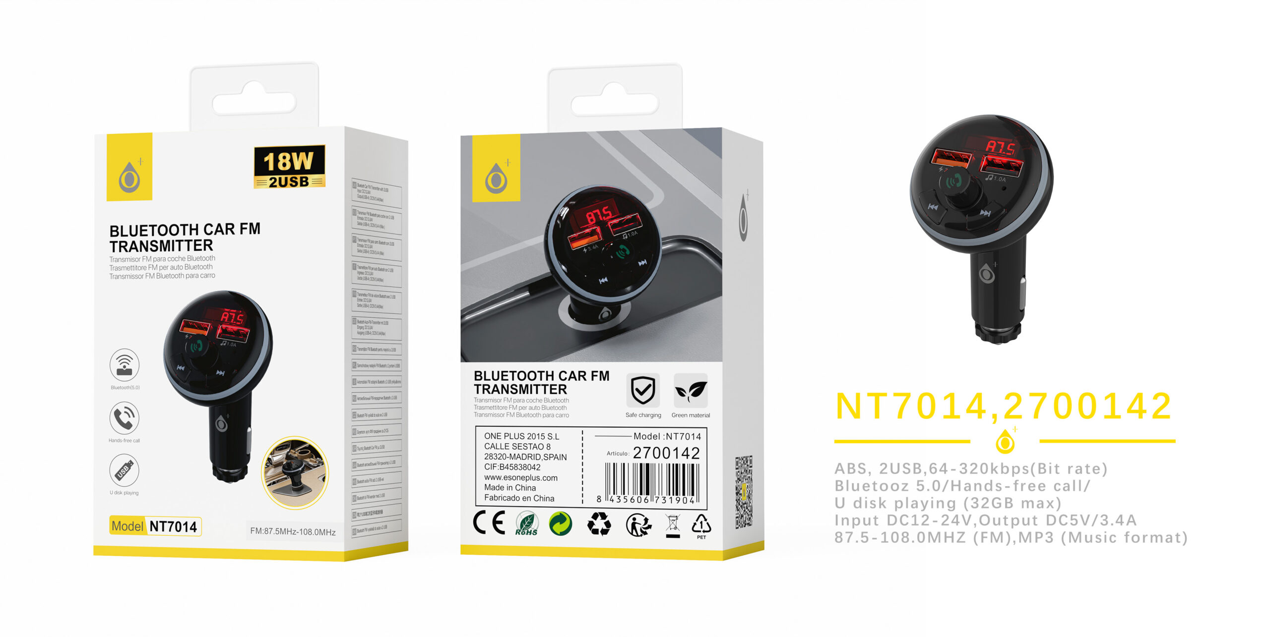NE NT7014 Transmisor Blutooth 5.0 con 2* USB-A 18W, Soporta Mano libre/USB(32G MAX), Negro