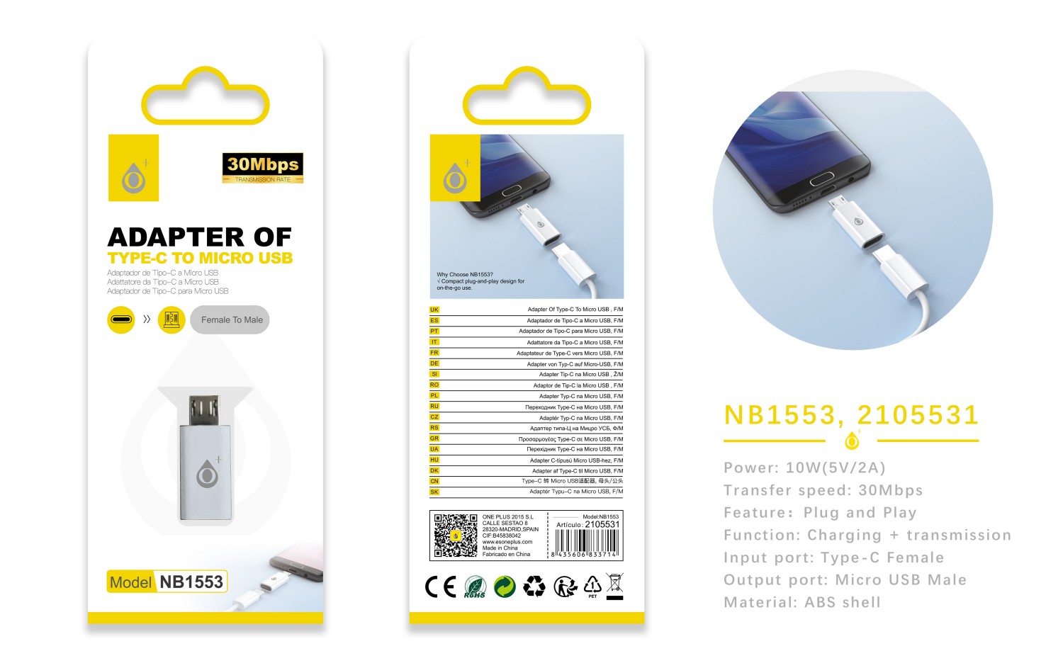 NE1553 BL Adaptador Type-C  a Micro USB , 30Mbps/10W, Blanco