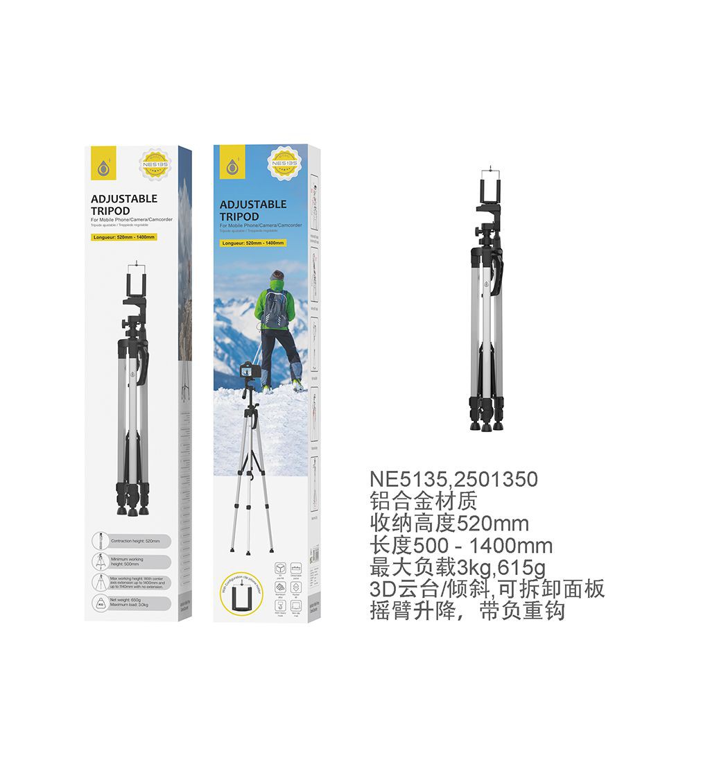 NE5135 BL Tripode Aluminio para Moviles, Camaras y Videocamaras, 360 grados Extensible (50cm – 140cm), Blanco