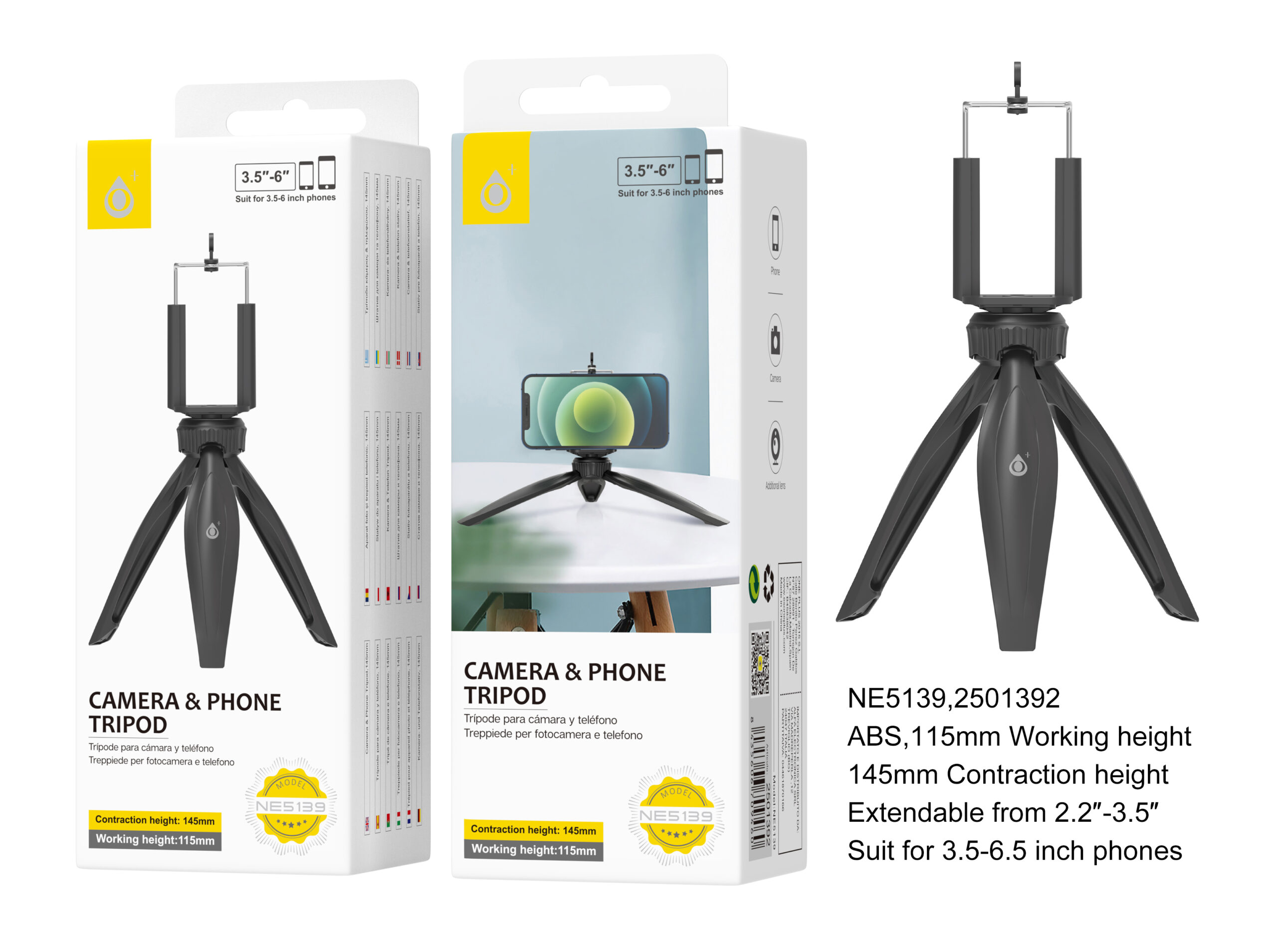 NE5139 NE Soprote Tripode Multiuso para Moviles y C¨¢maras, Compatible para Moviles de 3.5-6.5 Pulgadas, Altura Ajustable 11.5 – 14.5cm, Negro