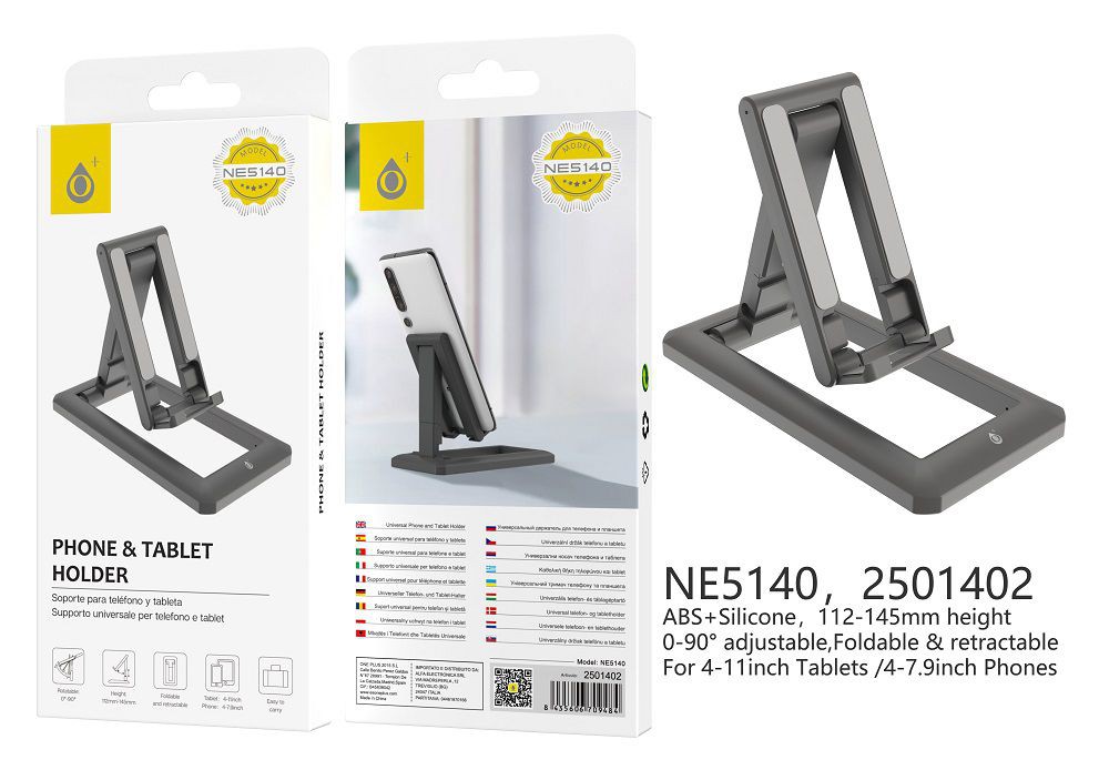 NE5140 NE Soporte Universal para Tablets y Moviles de 4-11 pulgadas, Base silicona, 90 grados Ajustable, Pregable y Extensible, Altura de 112-145mm, N