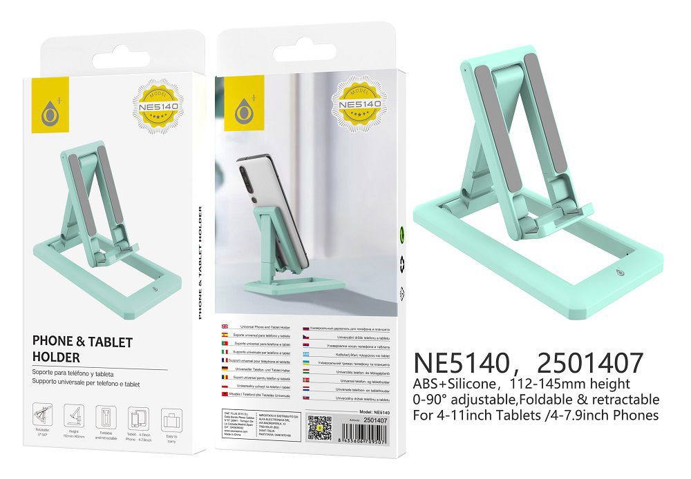 NE5140 VE Soporte Universal para Tablets y Moviles de 4-11 pulgadas, Base silicona, 90 grados Ajustable, Pregable y Extensible, Altura de 112-145mm, V