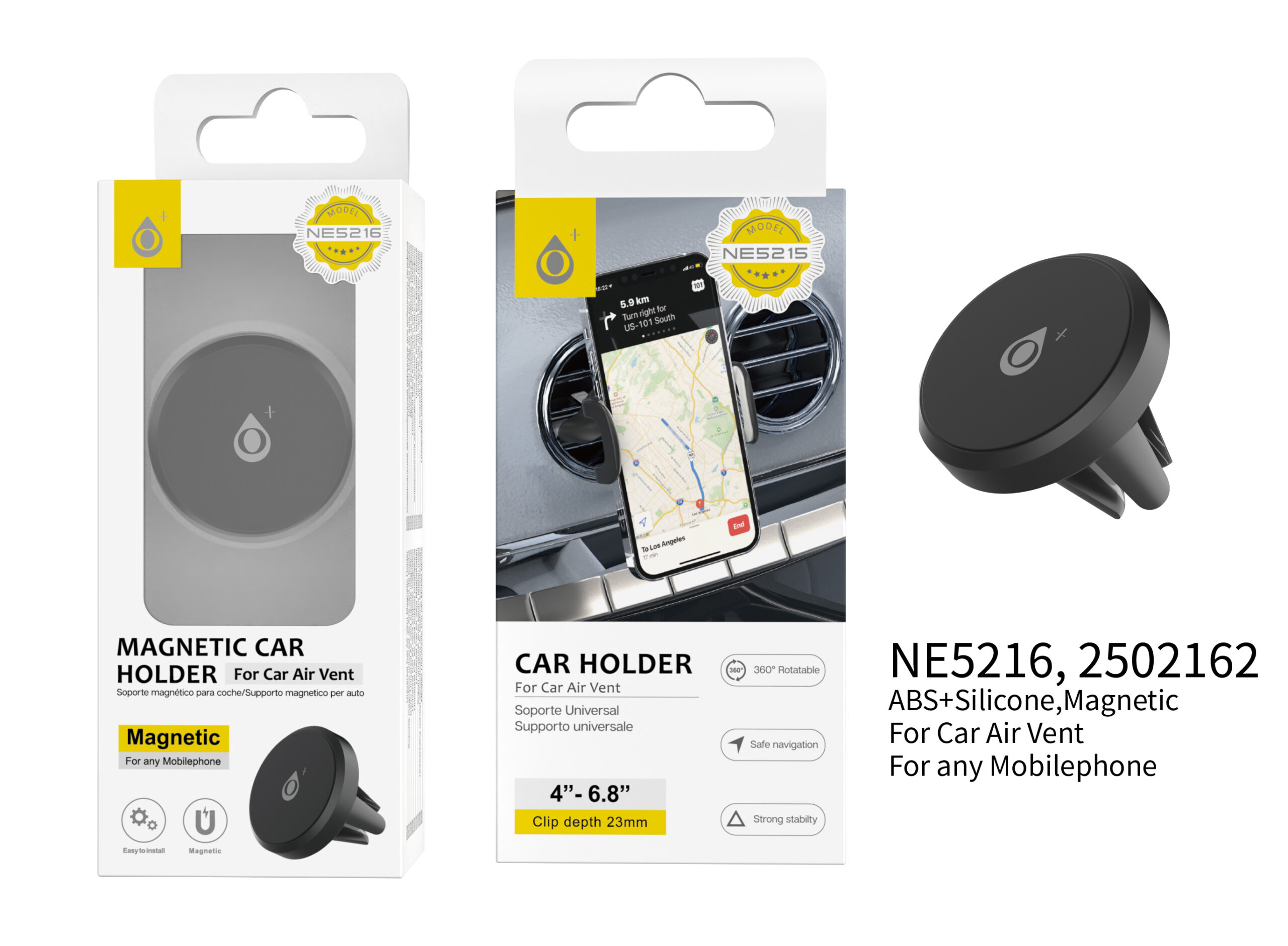 NE5216 NE Soporte Universal de coche para movil airvent magnetico  giratoria 360° , Clip 23mm Para movil 4-6.8 Pulgada , Negro