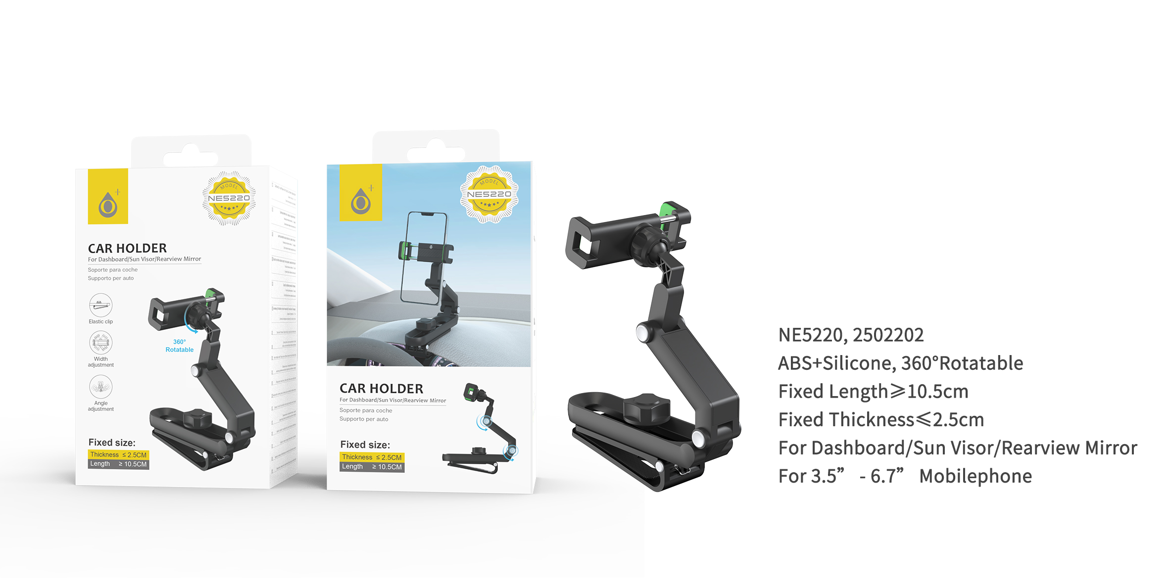 • NE5211 NE Soporte universal para salpicadero/Retrovisor interior y Parasol, giratorio 360° para movil 5-6.7 pulgadas,Negro