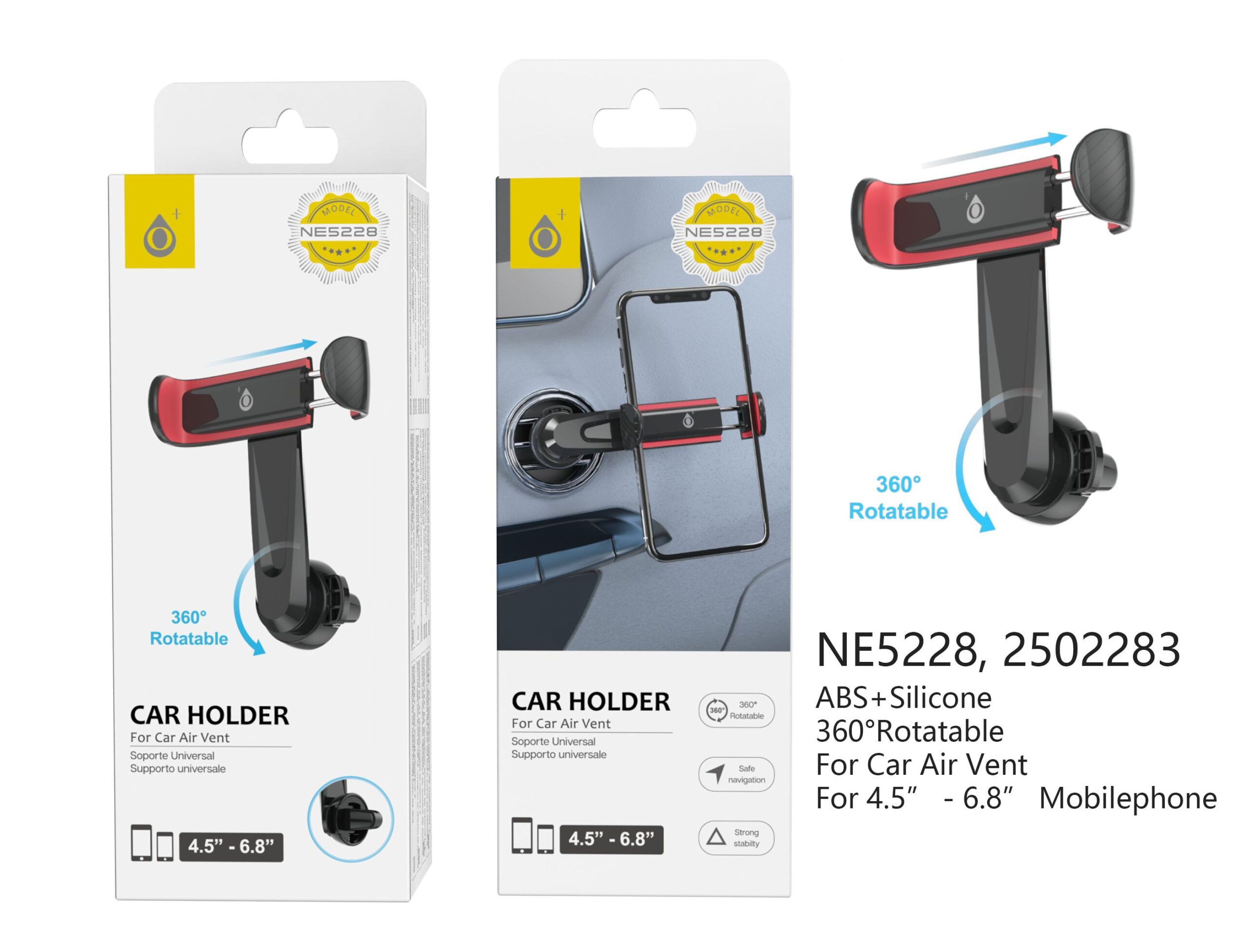 NE5228 RJ Soprte Universal de coche para movil airvent 360° giratoria , Para movil 4.5-6.8 , Rojo