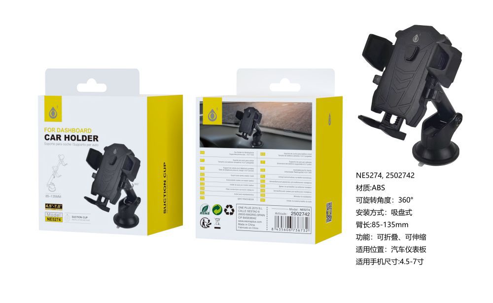 NE5274 NE Soporte universal de movil para Salpicadero y Parabrisas,Brazo Extensible 85-135mm ajustable 360°grado,Para Movil 4.5-7 Pulgadas,  Negro