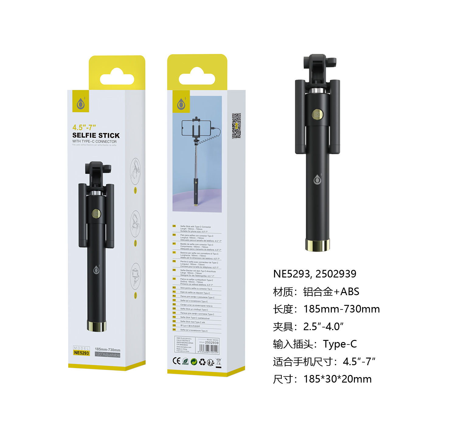 NE5293 Palo Selfie con Cable Type-C, flexible 120°, Brazo18.5-73CM, Para movil 4.5-7 Pulgadas, Negro+Amarillo