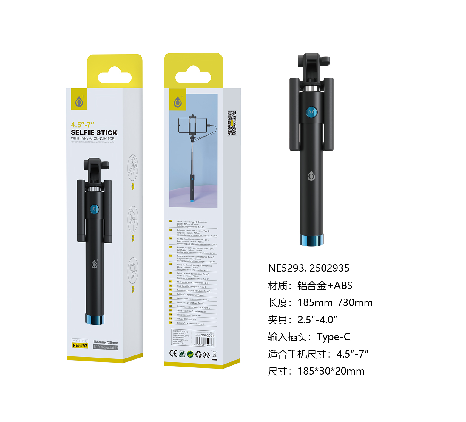 NE5293 Palo Selfie con Cable Type-C, flexible 120°, Brazo18.5-73CM,  Para movil 4.5-7 Pulgadas, Negro+Azul