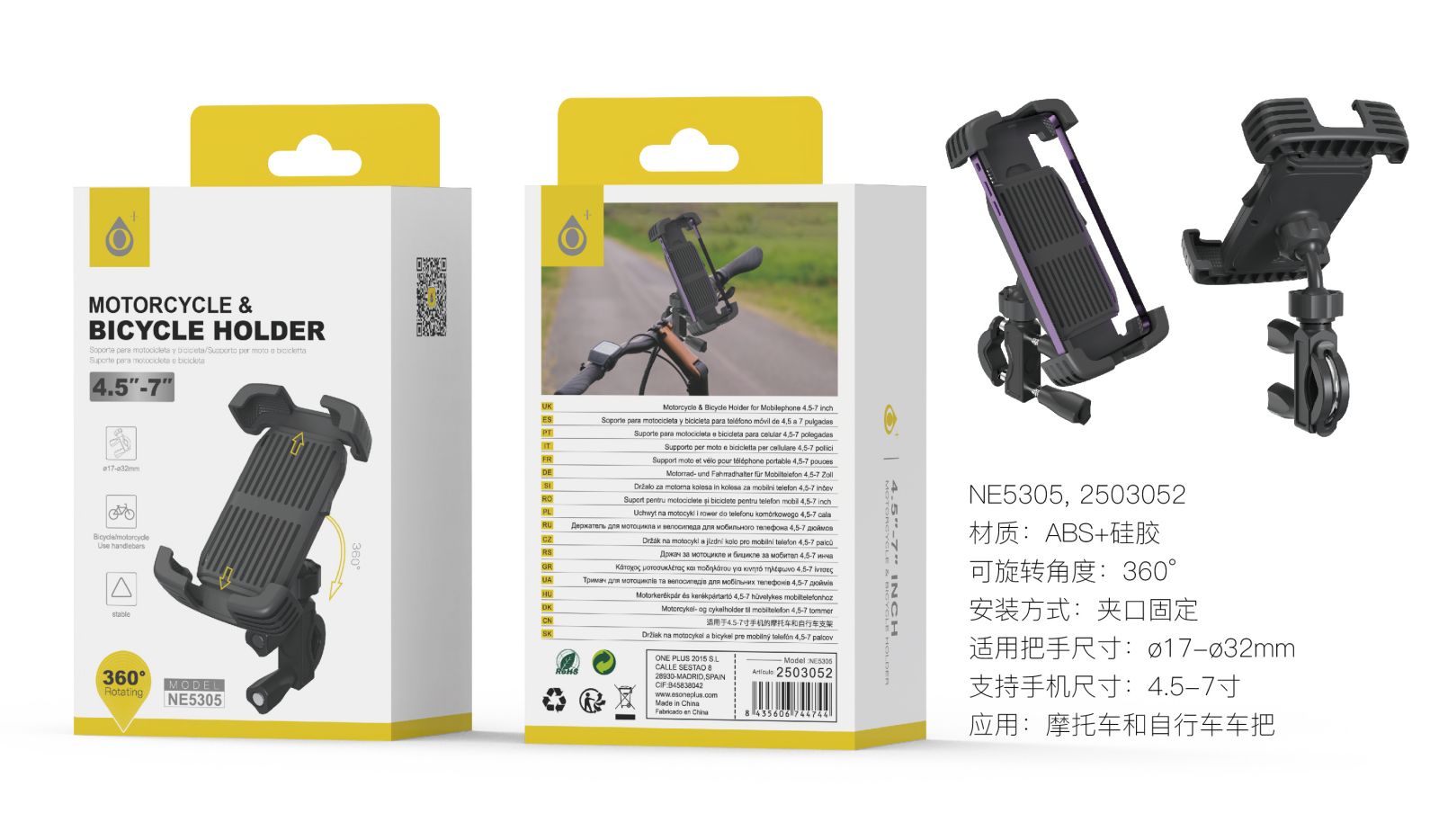 NE5305 NE Soporte Universal de movil para Bicicleta y moto, 360° Rotacion, Para movil 4.5-7 Pulgadas, Negro