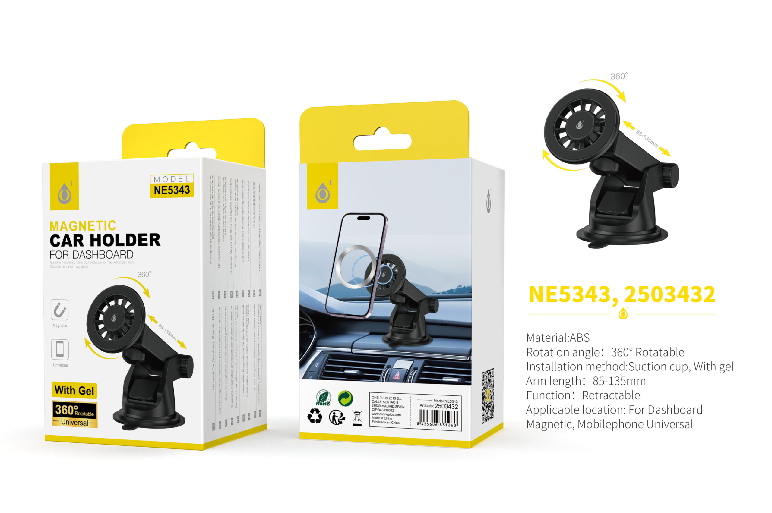 NE5343 NE Soporte universal con gel de movil magnetico para salpicadero de coche, Blazo plegable 85-135mm, ajustable 360°grado, Negro