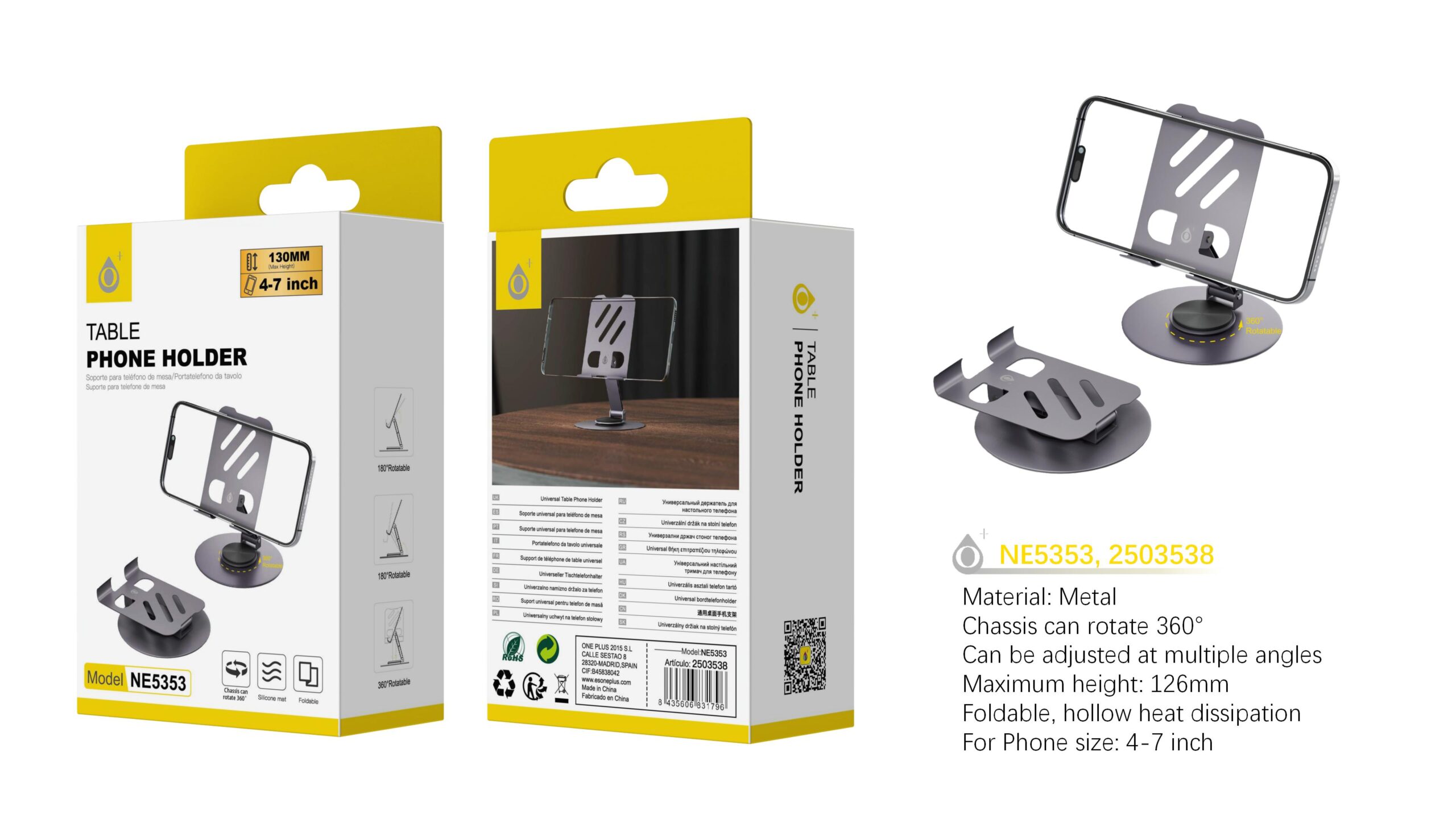 NE5353 GR Soporte metalica de mesa para movil 4-7 Pulgadas, Plegable 13cm y giro 360°, Gris