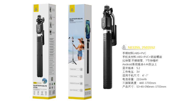 NE5355 NE Palo selfie tripode acero inoxidable con Bluetooth 5.2 para moviles 4-4.7, Altura 1.7M, Negro