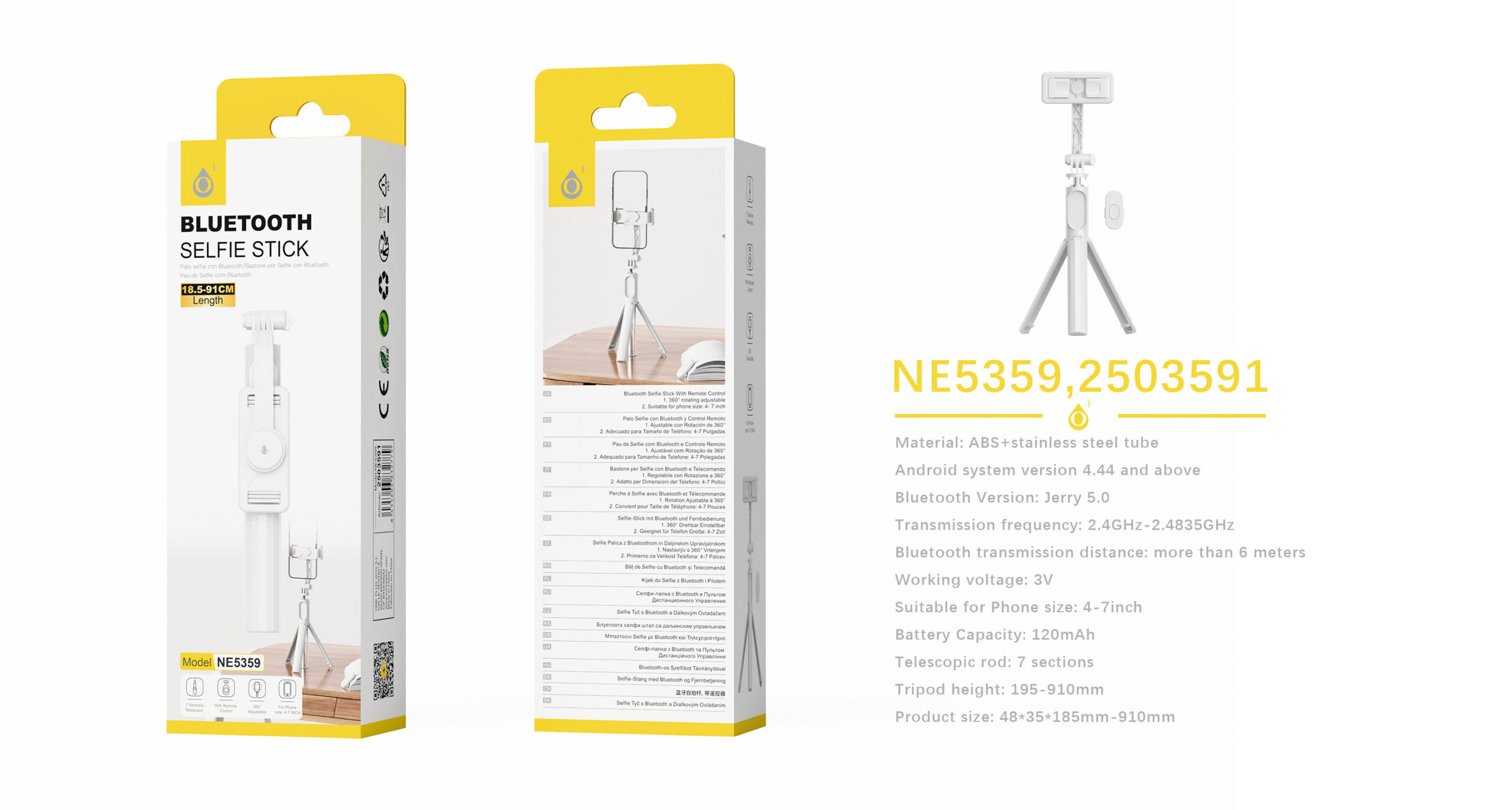 NE5359 BL Palo Selfie Tripode con Bluetooth brazo plegable 19.5-91cm Para movil 4-7 Pulgadas, Blanco