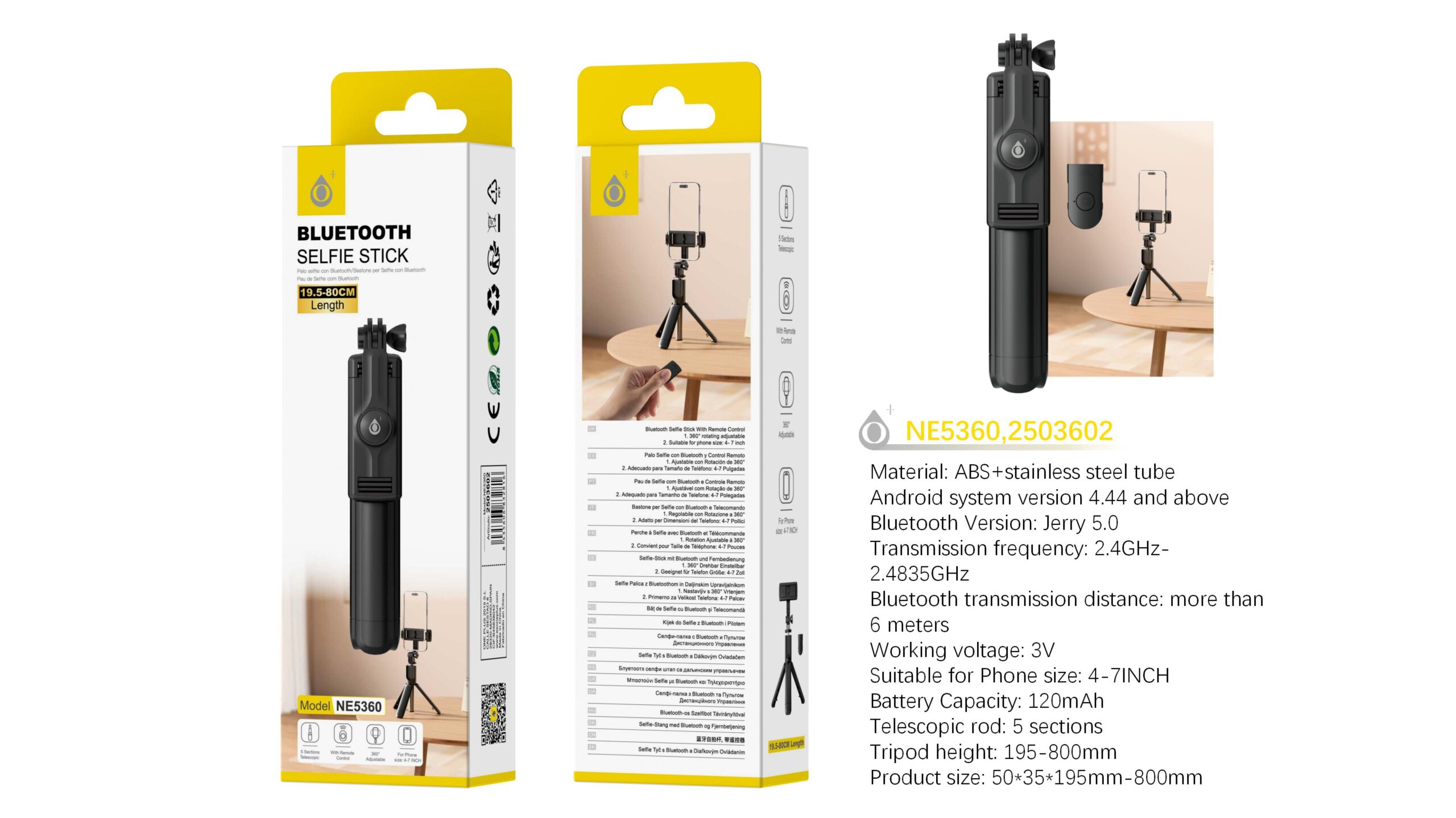 Captura todos tus momentos con el Palo Selfie Trípode NE5360, el accesorio 2 en 1 que combina un palo selfie con un trípode estable, ideal para fotos, grabaciones y videollamadas. Su diseño compacto y plegable lo convierte en el compañero perfecto para tus viajes y actividades diarias.