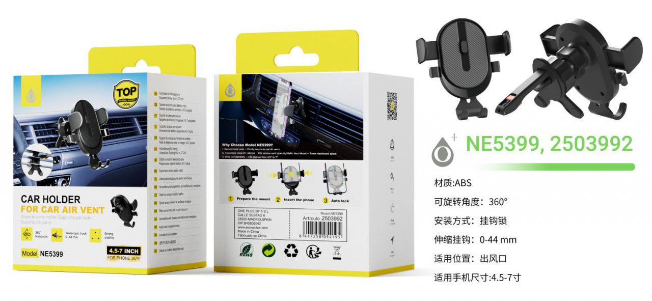 NE5399 NE Soporte Universal Airvent de coche para movil 4.5-7 Pulgadas,retractil 0-44MM 360° Rotacion, Negro