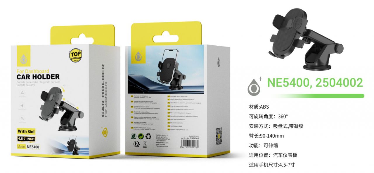 NE5400 NE Soporte universal de movil con gel para Salpicadero y Parabrisas , Brazo Extensible 90-140mm, 360° Giratoria ,Para Movil 4.5-7 Pulgadas, Negro
