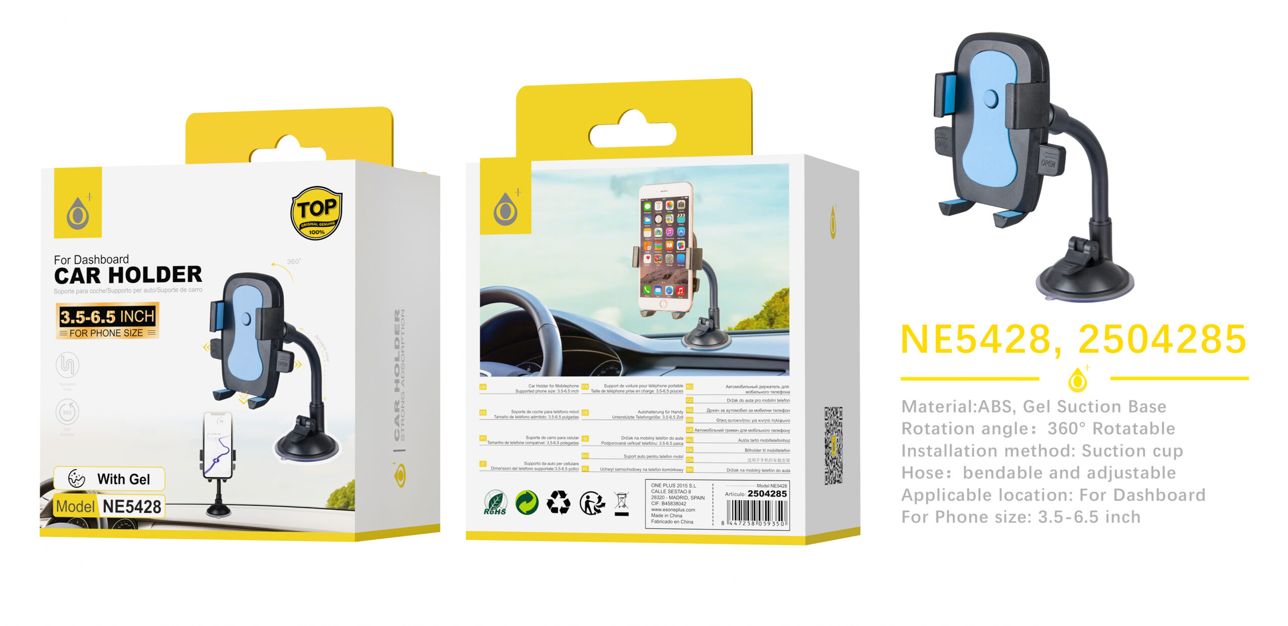 NE5428 AZ Soporte universal de movil con gel para salpicadero y parabrisas, Brazo flexible, 360° Giratoria, 4.5-7 Pulgadas, Azul