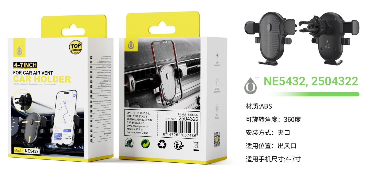 NE5432 NE Soporte universal airvent de coche para movil 4-7 Pulgadas, 360° Rotacion, Negro