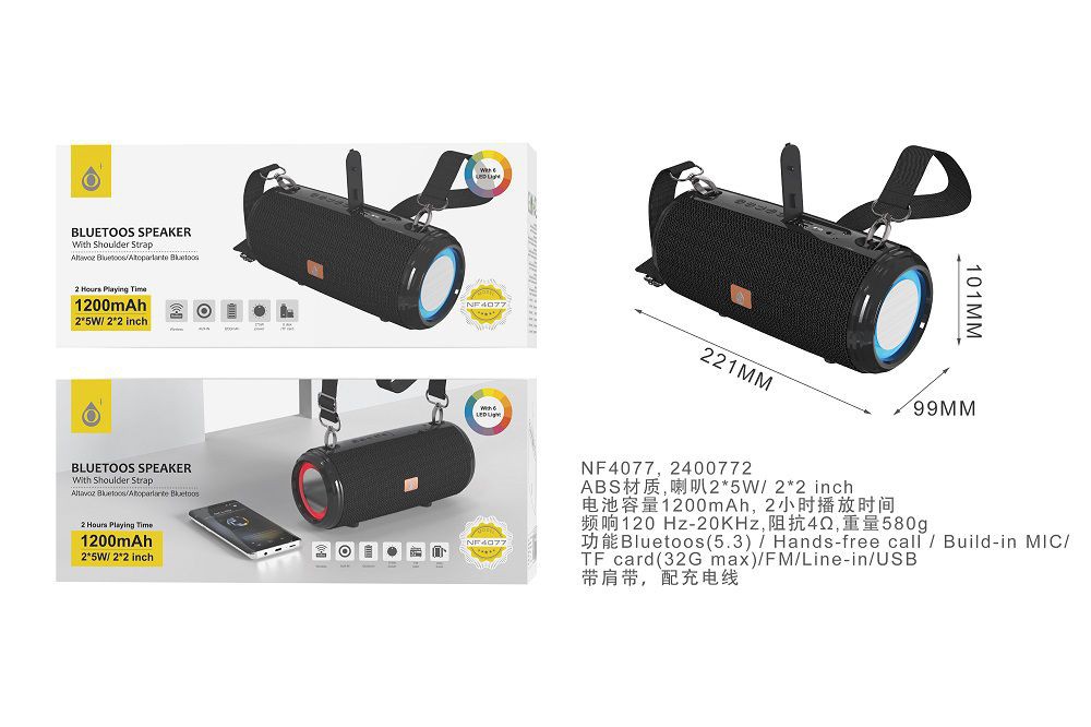 NF4077 NE Altavoz Blutooth Portátil con 7 luz LED 2x5W Reproducción de Música 2 hora ,Bateria 1200mAh, FM,USB,TF card,Audio,Negro