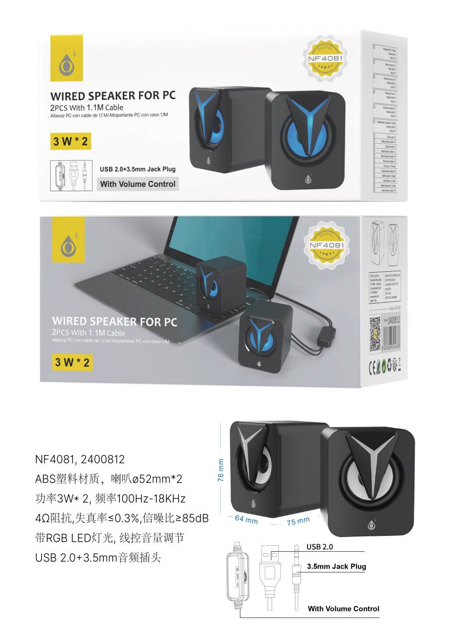 NF4081 NE Altavoz de PC  con  Control de Volumen, Luz Led RGB con Cable 1.1 Metros ,USB 2.0+3.5 JACK Plug , Negro