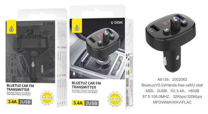 • A6139 NE Transmisor Bluetooth Believe para coche , 2 USB con 3,4A Max, Controlador de llamada y Volumen, FM/USB, Negro