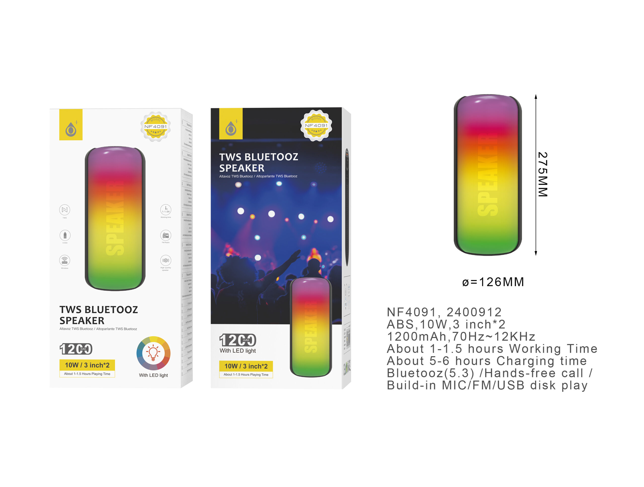 NF4091 NE Altavoz TWS Bluetooth 5.2 con luz LED,Mano libre /Entrada de microfono /USB /FM , Bateria1200mAh/2*3W, Negro