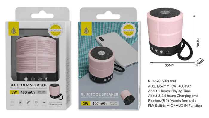 NF4093 RS Mini Altavoz Bluetooth 5.0, Soporta Mano Libre/Entrada de audio/FM/USB/TF(32G max), Bateria 400mAh/3W, Rosa