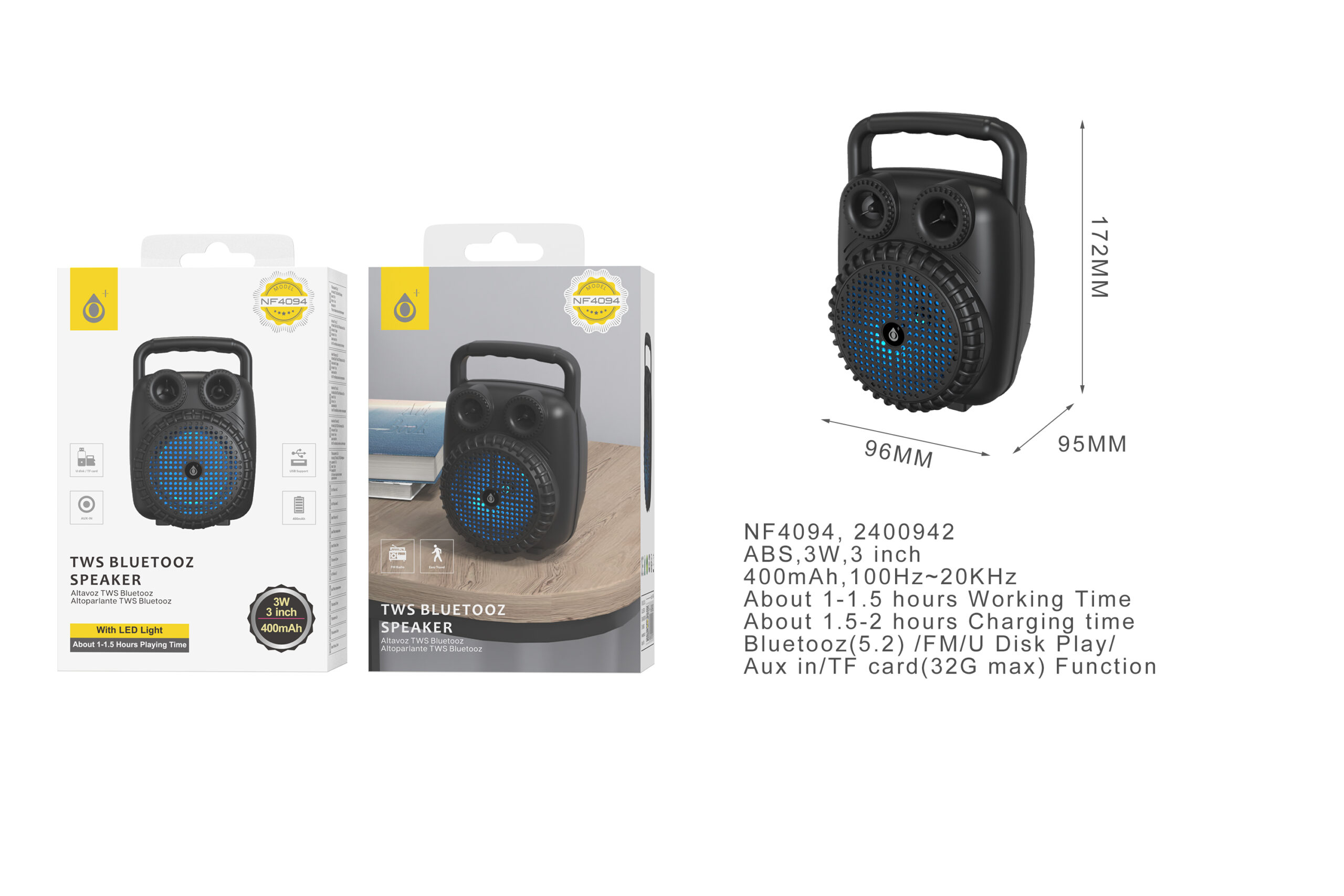 NF4094 NE Altavoz TWS Bluetooth 5.2 con luz LED,Frecuncia 100Hz-20KHz,  Entrada de microfono /USB/FM/TF(32G Max), Bateria 400mAh/3W, Negro