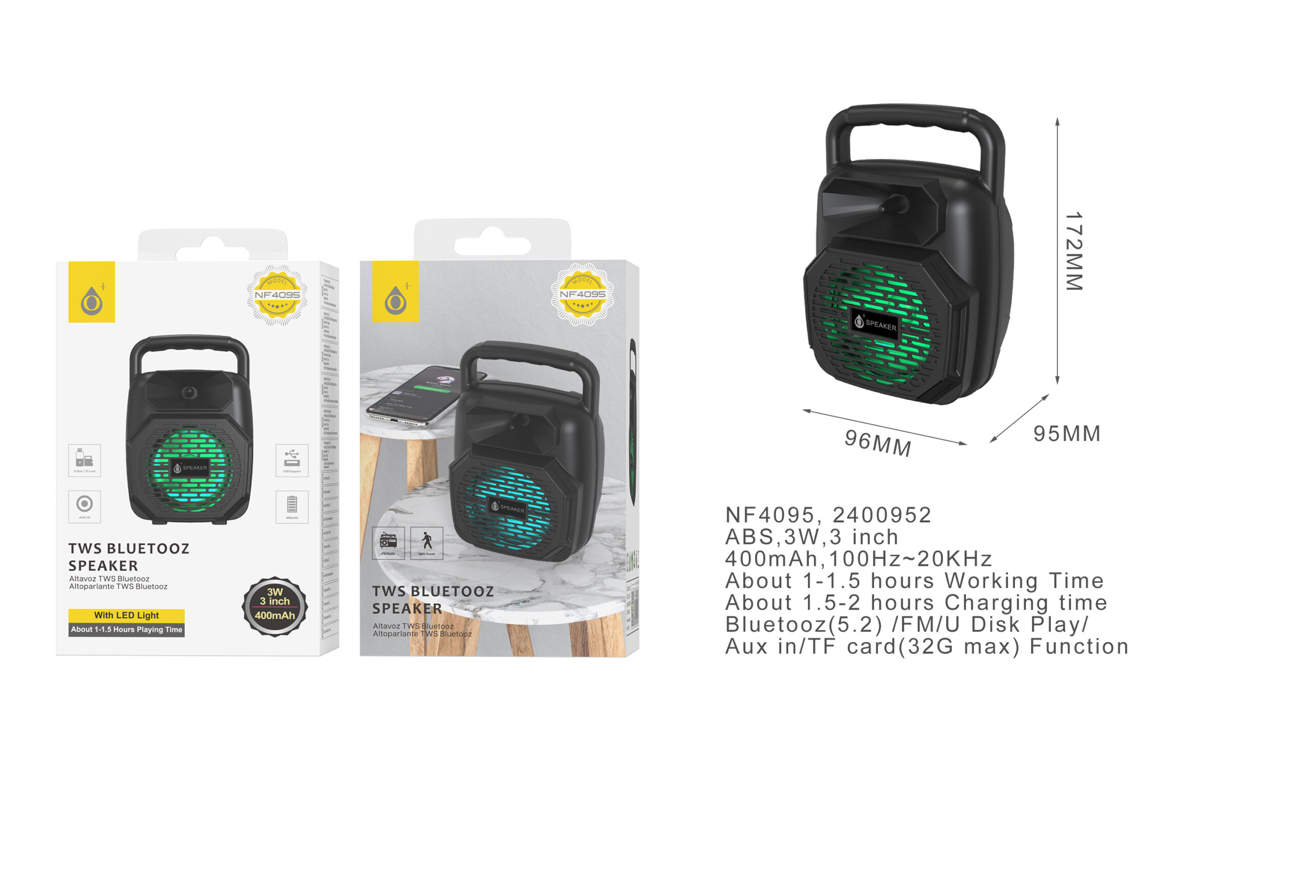 NF4095 NE Altavoz TWS Bluetooth 5.2 con luz LED, Frecuncia 100Hz-20KHz, Entrada de microfono /USB/FM/TF(32G Max) , Bateria 400mAh/3W, Negro