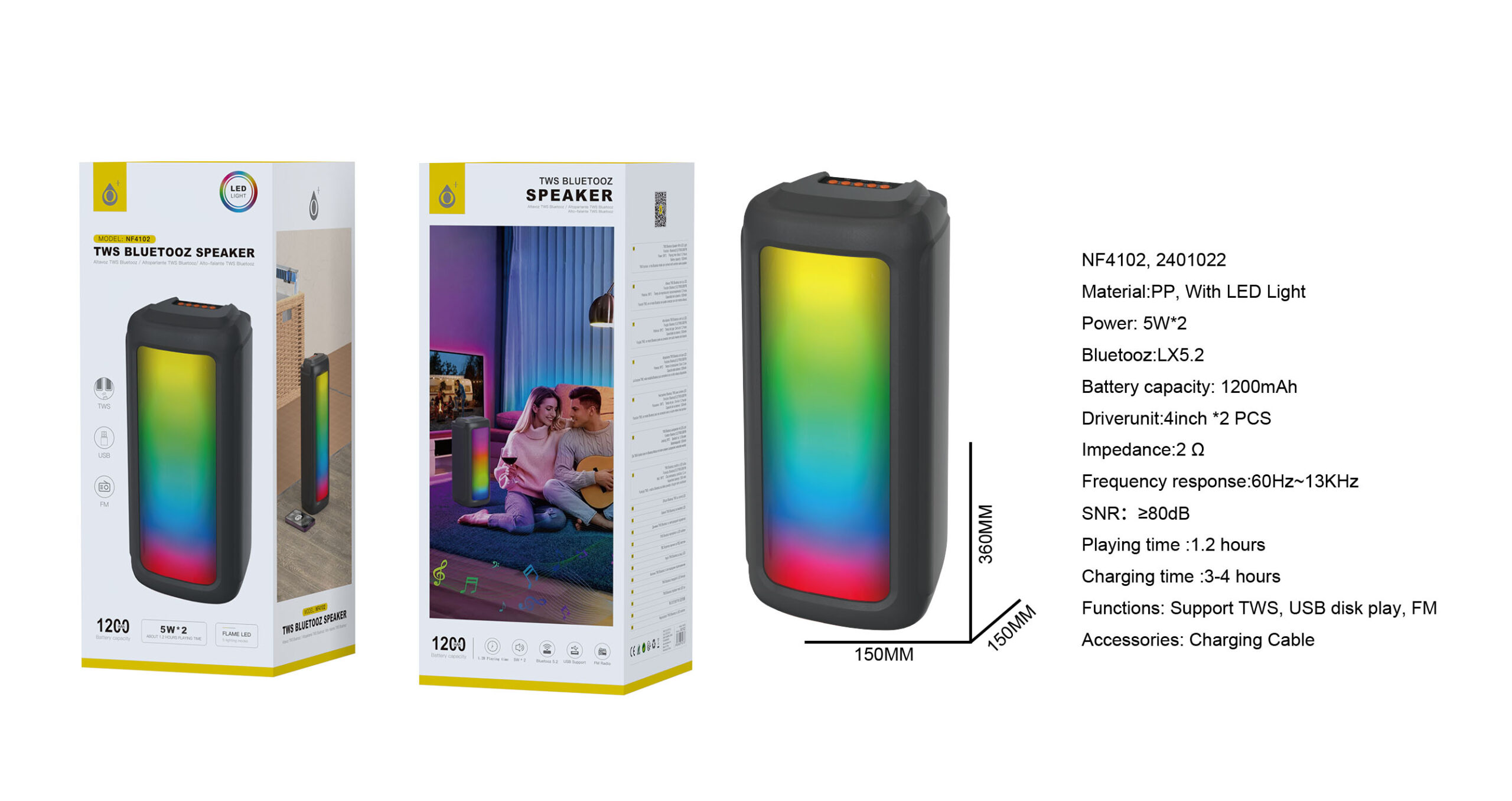 • NF4083 AZ Altavoz TWS Bluetooth 5.3 con luz LED,Mano libre /entrada de microfono /TF /FM , 2*5W/3.7V