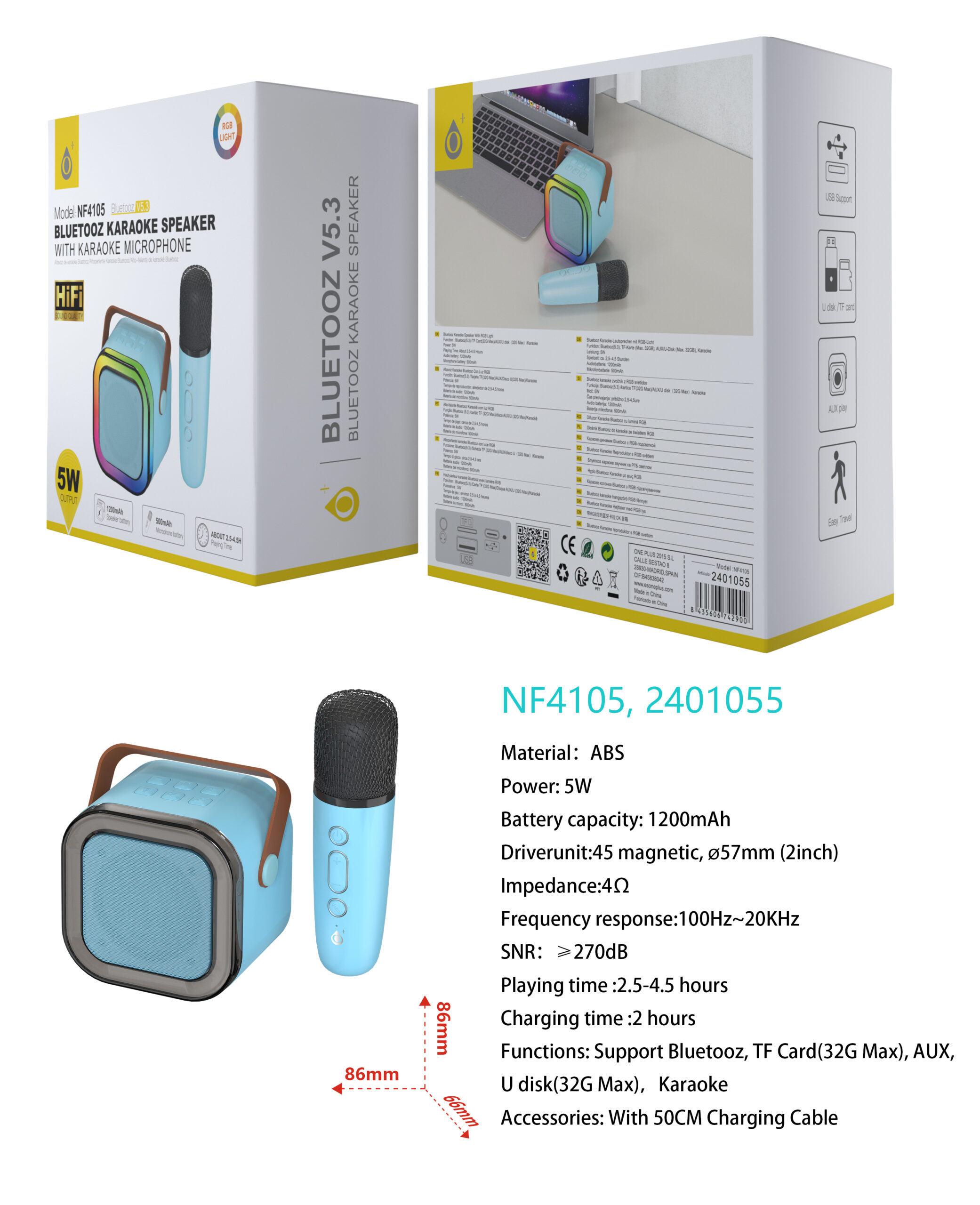 NF4105 AZ Hifi Altavoz TWS Coin 5W, BTS V5.3, Bateria 1200mah + 500mah Microfono inalambrico, Luz RGB, Soporta a cable audio y tarjeta TF, 4.5h de uso, Azul