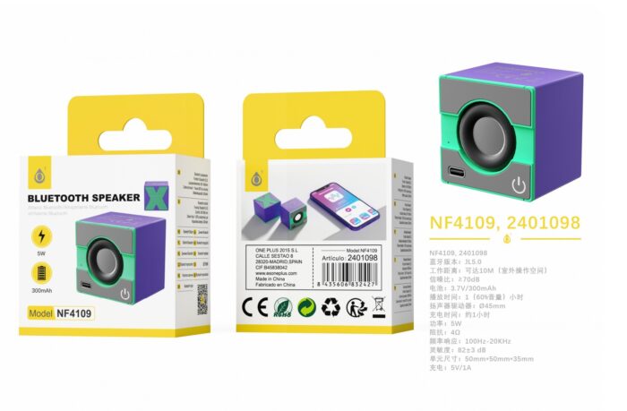 NF4109 MR+VE+GR Mini altavoz Bluetooth 5.0 con simbolo X, Altavoz 45mm, Bateria 300mAh/5W, Morado+verde+gris