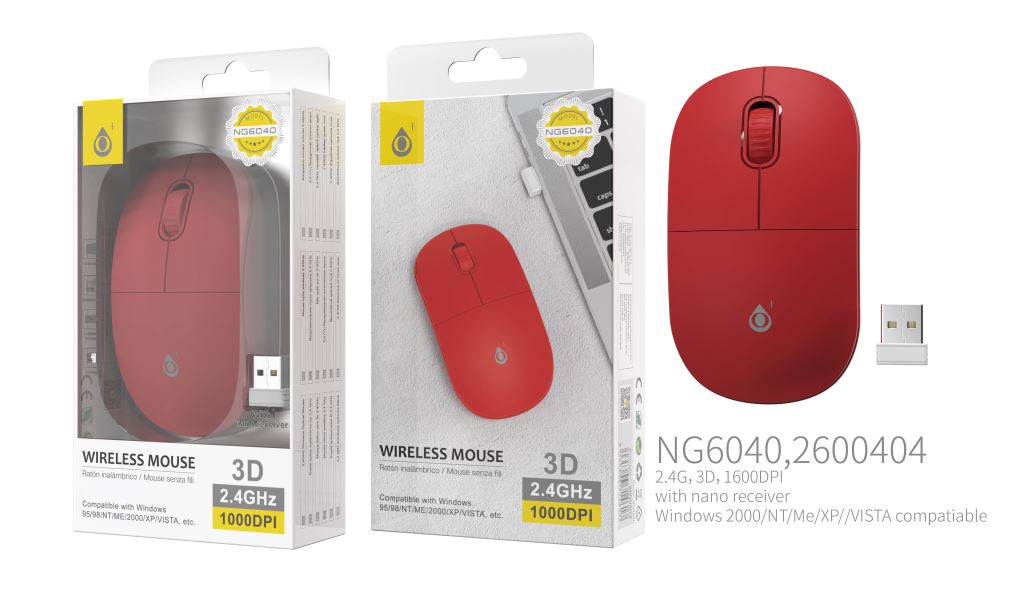 NG6040 RJ Ratón Inalámbrico Rubber, 2.4GHz, con nano receptor, 1000 DPI, Rojo